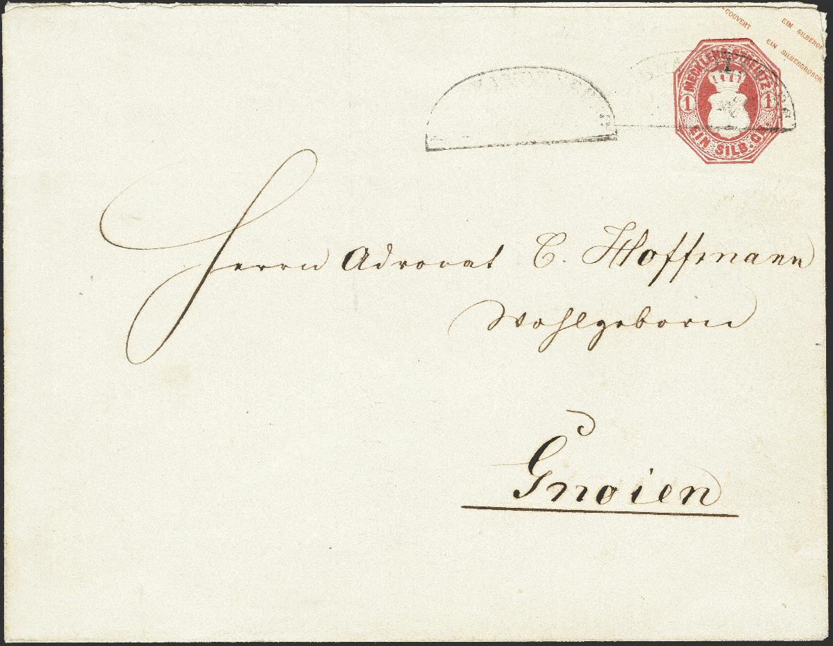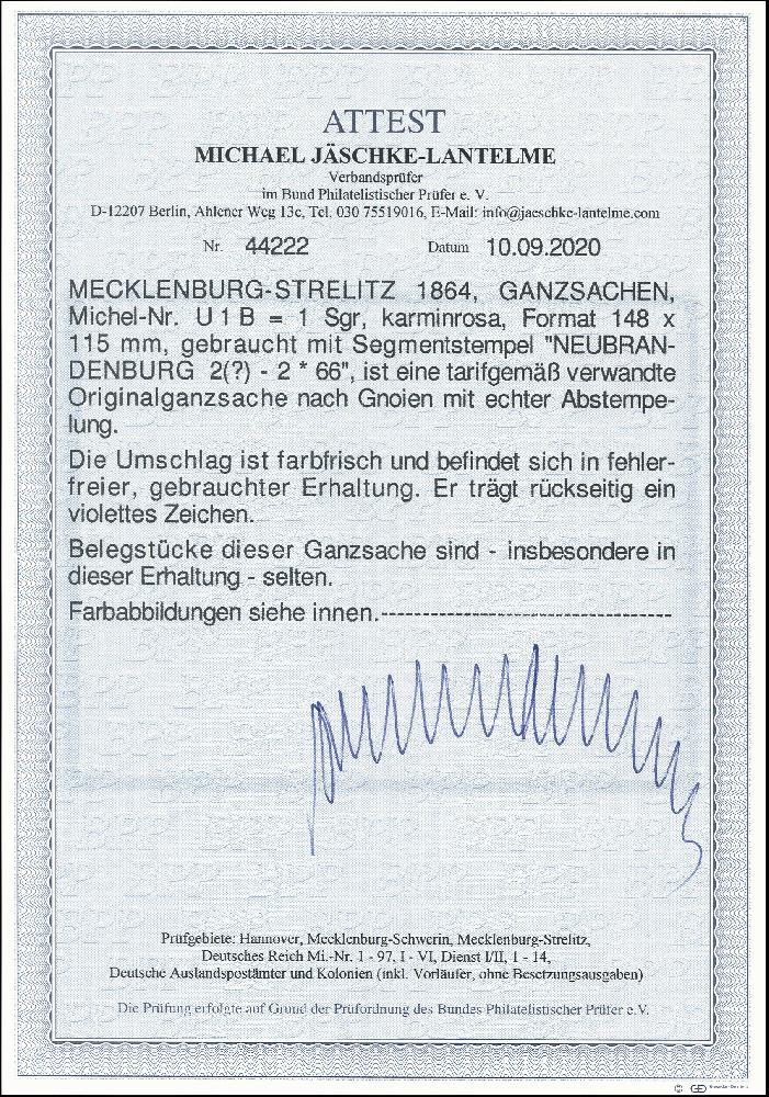 | Zusatzinformationen und Suchstichworte: | 376. Auktion Heinrich Köhler 19.-24. April 2021 Los 115 1864, Ganzsachenumschlag 1 Silbergroschen karminrosa im Großformat mit leicht auf- und nebengesetztem Segmentstempel "NEUBRANDENBURG 2 ..-2*66" nach Gnoien mit rückseitigem Bahnpoststempel der Friedrich-Franz-Bahn; sehr schöne frische und einwandfreie Erhaltung. Eine seltene Ganzsache. Fotoattest Jäschke-L. BPP (2020) Ausruf 800,00 EUR Zuschlag 1.200,00 EUR (aus der Sammlung Erivan Haub) |
