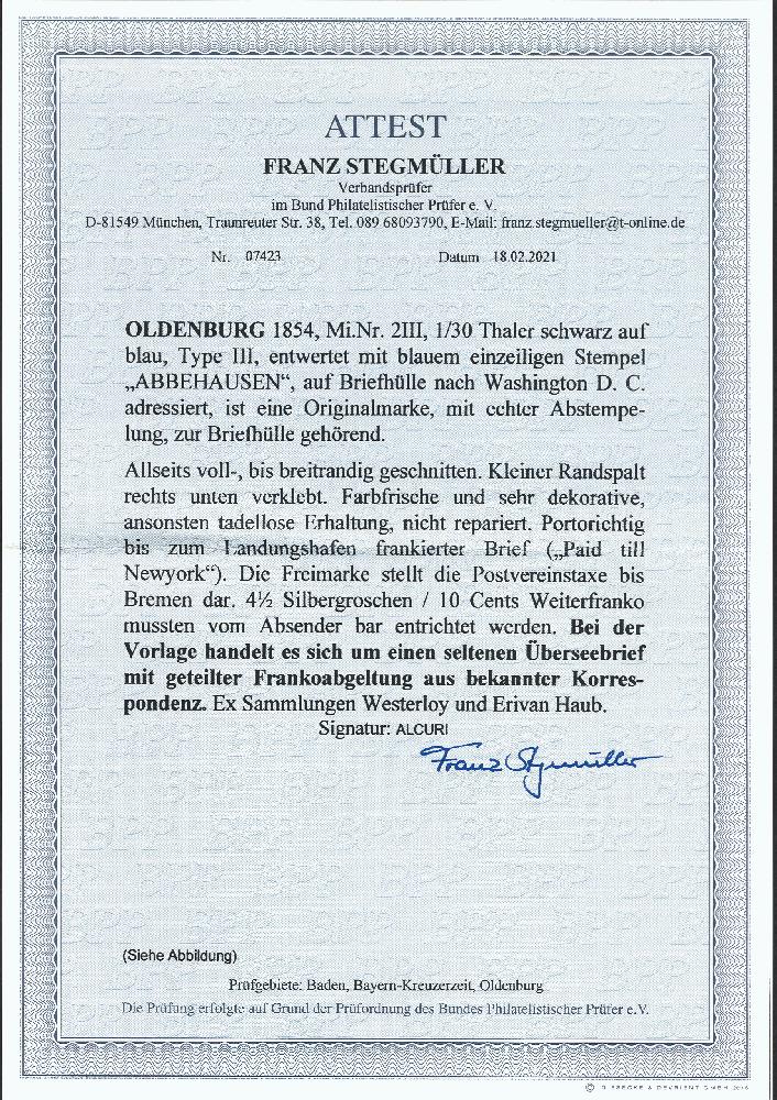 | Zusatzinformationen und Suchstichworte: | 376. Auktion Heinrich Köhler 19.-24. April 2021 Los 118 1/30 Thaler schwarz auf blau, Type III, voll- bis breitrandig mit sauber auf- und nebengesetztem blauen Langstempel "ABBEHAUSEN" auf Briefhülle nach Washington D.C.; vorderseitiger Leitvermerk "By Steamer Herrmann" und befördert über "ST.P.A. BREMEN 29 11". Der Brief war bis New York bezahlt mit insgesamt 5½ Silbergroschen, davon jedoch nur das Vereinsporto bis Bremen frankiert, der übrige Betrag in bar bezahlt und unten links vermerkt "Paid till New York 4½ Sgr.". Bei der Marke ein kleiner Randspalt unten verklebt, die Briefhülle mit kleinen Beförderungsspuren, sonst einwandfrei. Ein attraktiver Transatlantik-Brief mit 'geteiltem Franko'. Signiert Alcuri und Fotoattest Stegmüller BPP (2021) Ausruf 1.000,00 EUR Zuschlag 1.800,00 EUR (aus der Sammlung Erivan Haub) |