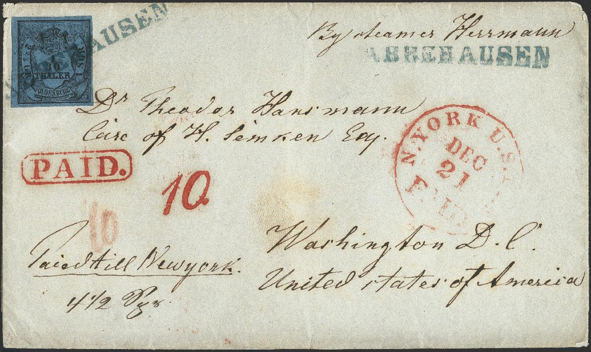 | Zusatzinformationen und Suchstichworte: | 376. Auktion Heinrich Köhler 19.-24. April 2021 Los 118 1/30 Thaler schwarz auf blau, Type III, voll- bis breitrandig mit sauber auf- und nebengesetztem blauen Langstempel "ABBEHAUSEN" auf Briefhülle nach Washington D.C.; vorderseitiger Leitvermerk "By Steamer Herrmann" und befördert über "ST.P.A. BREMEN 29 11". Der Brief war bis New York bezahlt mit insgesamt 5½ Silbergroschen, davon jedoch nur das Vereinsporto bis Bremen frankiert, der übrige Betrag in bar bezahlt und unten links vermerkt "Paid till New York 4½ Sgr.". Bei der Marke ein kleiner Randspalt unten verklebt, die Briefhülle mit kleinen Beförderungsspuren, sonst einwandfrei. Ein attraktiver Transatlantik-Brief mit 'geteiltem Franko'. Signiert Alcuri und Fotoattest Stegmüller BPP (2021) Ausruf 1.000,00 EUR Zuschlag 1.800,00 EUR (aus der Sammlung Erivan Haub) |