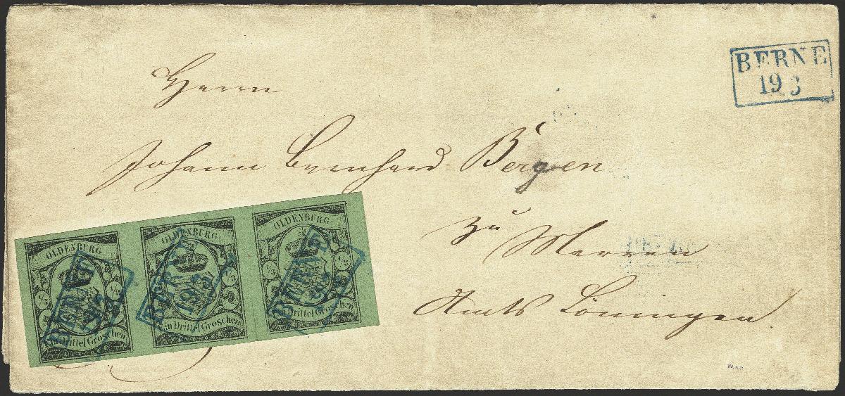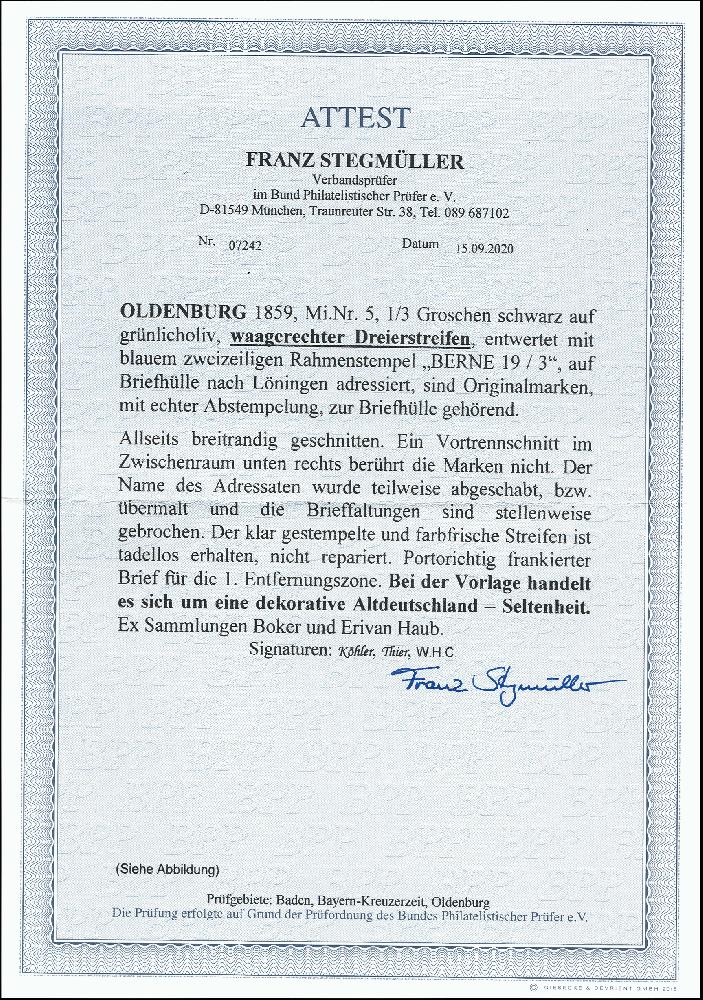 | Zusatzinformationen und Suchstichworte: | 376. Auktion Heinrich Köhler 19.-24. April 2021 Los 125 1859, 1/3 Groschen schwarz auf grün im waagerechten 3er-Streifen, sehr schön farbfrisch und allseits breit- bis überrandig mit sauber auf- und nebengesetztem kleinen blauen Rahmenstempel "BERNE 19/3" auf Briefhülle nach Löningen. Der Streifen selbst befindet sich in sehr frischer und tadelloser Erhaltung, ein Vortrennschnitt zwischen den beiden rechten Werten berührt die Markenbilder nicht; der Name in der Adresse etwas abgeändert und die Brieffaltungen stellenweise gebrochen bzw. etwas gestützt. Insgesamt ein äußerst attraktiver Brief mit einem der schönsten Streifen dieser Marke; größere gebrauchte Einheiten dieser Marke sind nicht bekannt. Signiert Köhler, Thier und Colson, Fotoattest Stegmüller BPP (2020) Ausruf 30.000,00 EUR Zuschlag 46.000,00 EUR (aus der Sammlung Erivan Haub) |