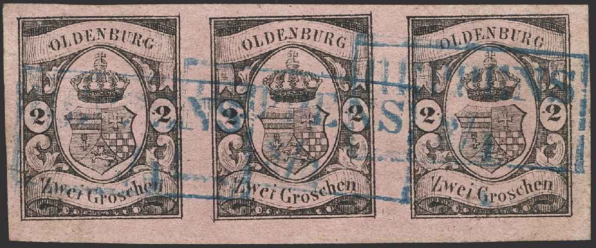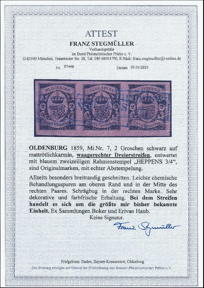 | Zusatzinformationen und Suchstichworte: | 376. Auktion Heinrich Köhler 19.-24. April 2021 Los 128 1859, 2 Groschen schwarz auf rosa im waagerechten 3er-Streifen, schöne tiefe Farbe und allseits sehr breitrandig, entwertet durch blauen Rahmenstempel "HEPPENS 3/4" mit zugehörigem Briefstück (zur Kontrolle gelöst). Die rechte Marke des Streifens unauffällige senkrechte Bugspur, rückseitig am Oberrand und im Bereich des rechten Paares leichte Spuren chemischer Behandlung, sonst gute und sehr attraktive Erhaltung. Größte bekannte Einheit dieser Marke und Unikat; eine der großen Seltenheiten der Oldenburg-Philatelie. Ausruf 20.000,00 EUR Zuschlag 20.000,00 EUR (aus der Sammlung Erivan Haub) |