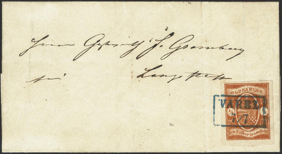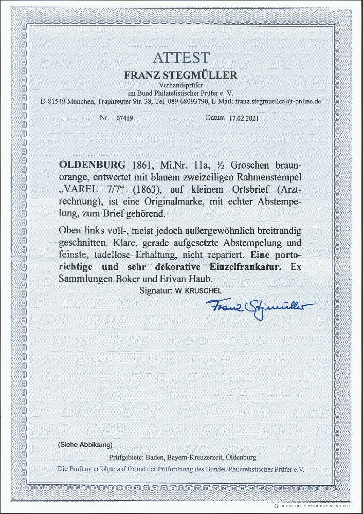 | Zusatzinformationen und Suchstichworte: | 376. Auktion Heinrich Köhler 19.-24. April 2021 Los 133 1861, ½ Groschen braunorange, farbfrisch und gut voll- bis meist sehr breitrandig, unten mit kleinem Teil der Nachbarmarke, mit klar und gerade aufgesetztem blauen Rahmenstempel "VAREL 7/7" (1863) auf komplettem kleinen Ortsbrief (Arztrechnung). Eine besonders attraktive Einzelfrankatur in tadelloser Erhaltung. Signiert Kruschel und Fotoattest Stegmüller BPP (2021) Ausruf 1.000,00 EUR Zuschlag 4.200,00 EUR (aus der Sammlung Erivan Haub) |