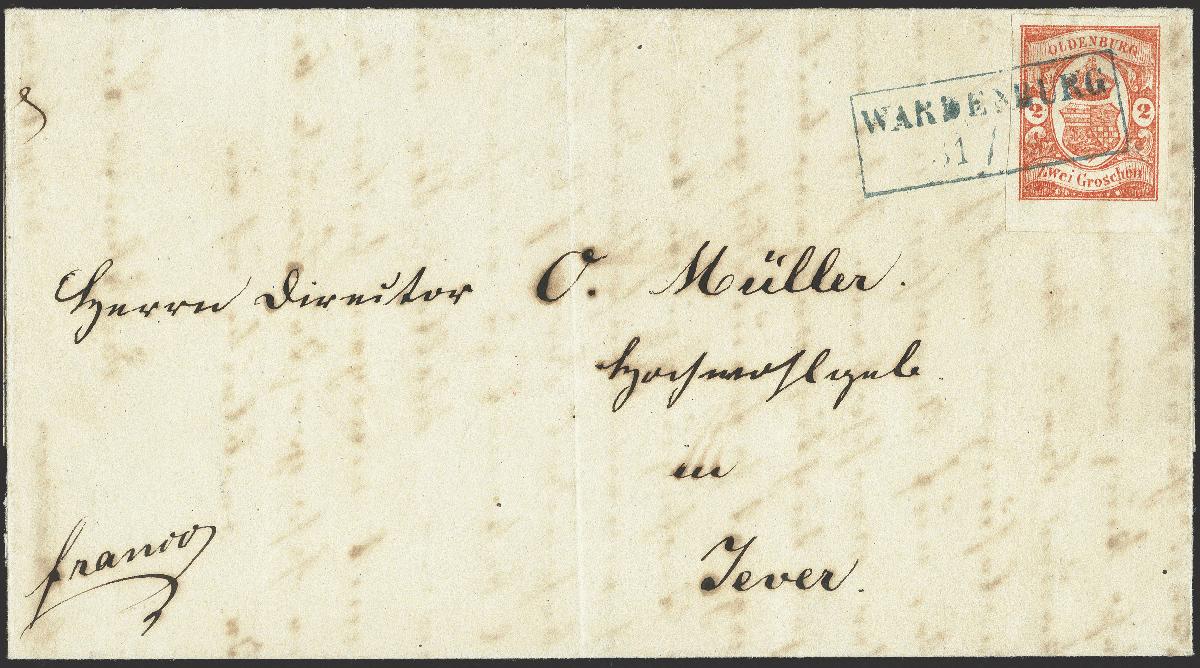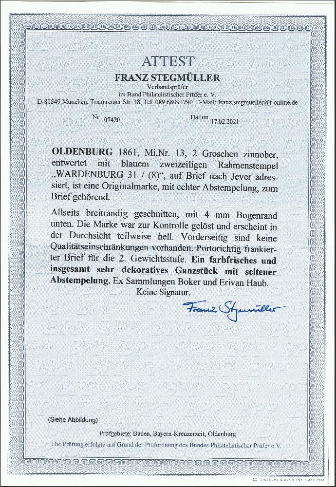 | Zusatzinformationen und Suchstichworte: | 376. Auktion Heinrich Köhler 19.-24. April 2021 Los 134 2 Groschen zinnober, farbfrisch und allseits breitrandig, unten mit 4 mm Bogenrand, mit sauber aufgesetztem blauen Rahmenstempel "WARDENBURG 31/(8)" auf Brief der 2. Gewichtsstufe nach Jever. Die Marke war zur Kontrolle gelöst und erscheint in der Durchsicht teilweise hell; optisch sehr attraktiver Brief mit seltenem Stempel. Fotoattest Stegmüller BPP (2021) Ausruf 400,00 EUR Zuschlag 1.800,00 EUR (aus der Sammlung Erivan Haub) |