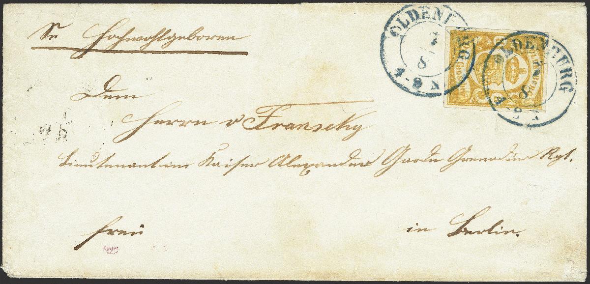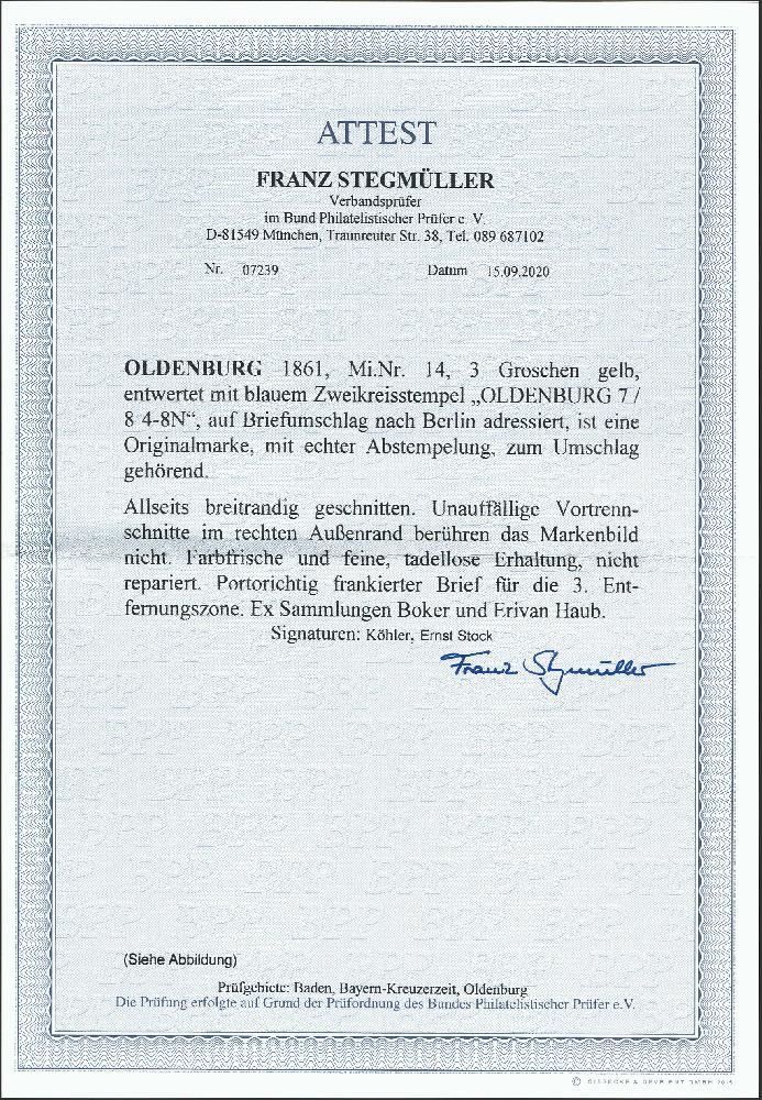 | Zusatzinformationen und Suchstichworte: | 376. Auktion Heinrich Köhler 19.-24. April 2021 Los 136 3 Silbergroschen gelb in dunkler, goldgelber Nuance, farbfrisch und für diese schwierige Marke außergewöhnlich breitrandig, mit zweimal nebeneinander aufgesetztem blauen Doppelkreisstempel "OLDENBURG 7/8" auf kleinem Briefkuvert nach Berlin mit rückseitigem Bahnpost- und Ausgabestempel. Im breiten Außenrand rechts unauffällige Vortrennschnitte; schöne und tadellose Erhaltung. Eine besonders attraktive Einzelfrankatur dieser Marke. Signiert Köhler und Ernst Stock, Fotoattest Stegmüller BPP (2020) Provenienz: 5. Köhler-Auktion (1913), John Boker jr. (1988) Ausruf 1.000,00 EUR Zuschlag 1.400,00 EUR (aus der Sammlung Erivan Haub) |