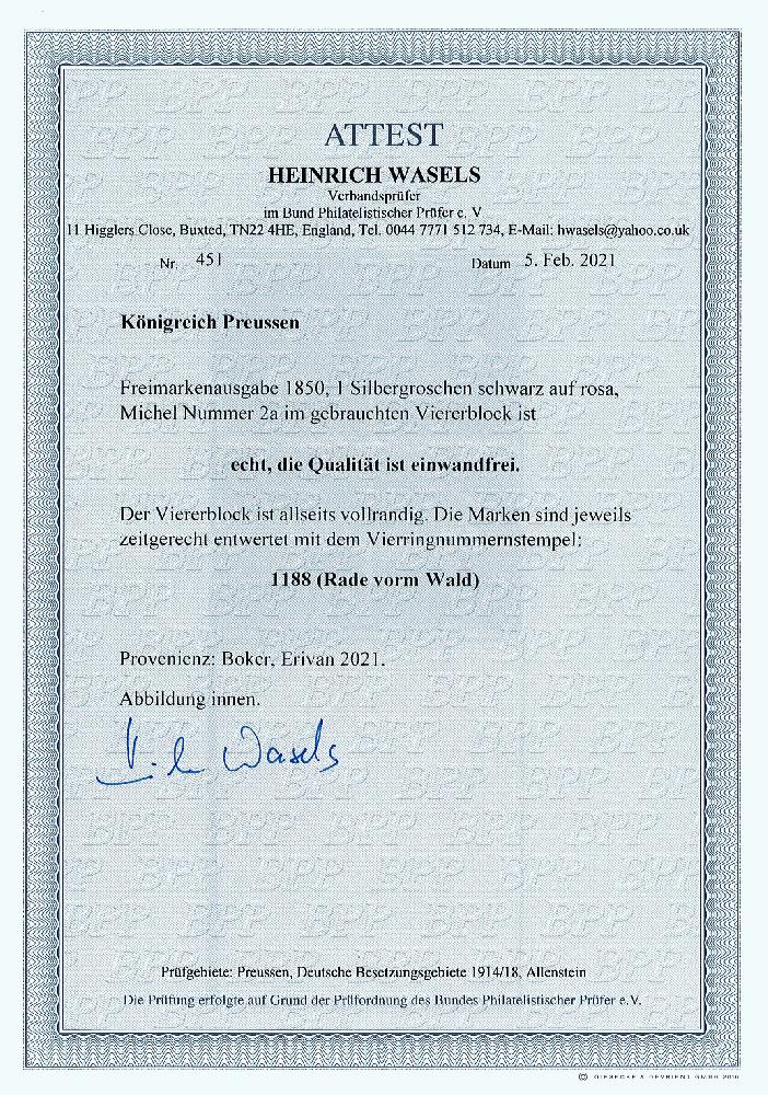 | Zusatzinformationen und Suchstichworte: | 376. Auktion Heinrich Köhler 19.-24. April 2021 Los 148 1 Silbergroschen schwarz auf rosa im 4er-Block, farbfrisch und voll- bis breitrandig, sauber entwertet durch Nummer 1188" RADE VORM WALD", Kabinett, Fotoattest Wasels BPP (2021) Ausruf 500,00 EUR Zuschlag 1.100,00 EUR (aus der Sammlung Erivan Haub) |