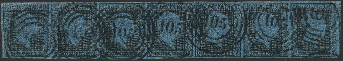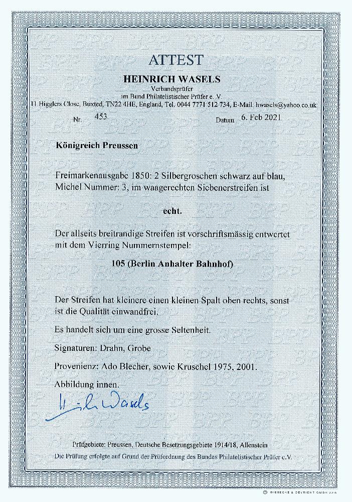 | Zusatzinformationen und Suchstichworte: | 376. Auktion Heinrich Köhler 19.-24. April 2021 Los 154 2 Silbergroschen schwarz auf blau im waagerechten 7er-Streifen, farbfrisch und allseits voll- bis überrandig, rechts und links mit kleinen Teilen der Nachbarmarken, entwertet durch Nummer "105" der Berliner Bahnpost; rechts oben kleiner Randschnitt, das Markenbild gerade berührend sowie bei derselben Marke winziges Sandkornloch, sonst tadellos. Zweitgrößte bekannte Streifeneinheit dieser Marke, von der wir nur eine weitere registriert haben. Signiert Drahn und Grobe, Fotoattest Wasels BPP (2021) Ausruf 1.500,00 EUR Zuschlag 3.400,00 EUR (aus der Sammlung Erivan Haub) |
