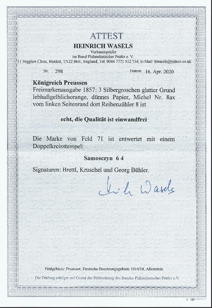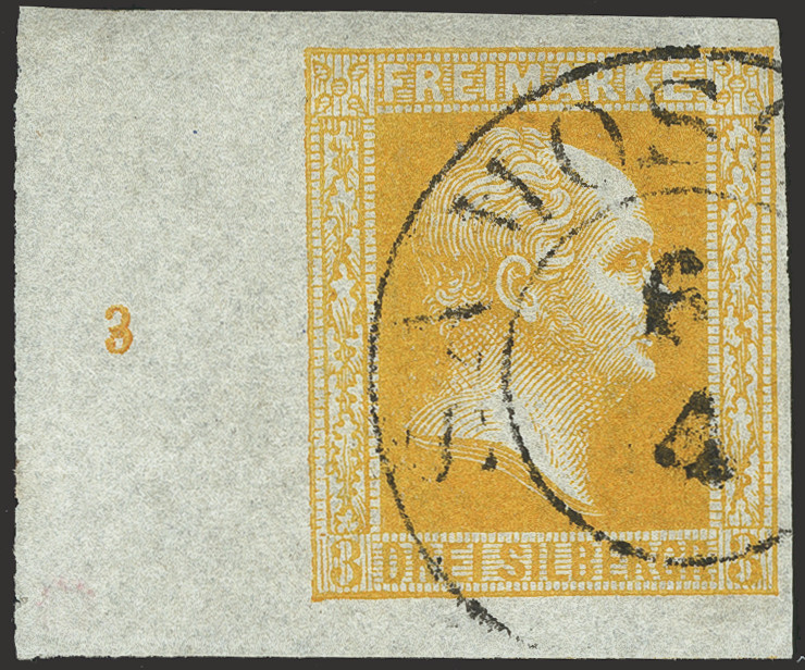 | Zusatzinformationen und Suchstichworte: | 376. Auktion Heinrich Köhler 19.-24. April 2021 Los 165 Glatter Grund 3 Silbergroschen gelborange auf dünnem Papier, farbfrisch und voll- bis breitrandig, links mit ca. 11 mm Bogenrand mit Reihenzäler "8", sauber entwertet durch Doppelkreisstempel "SAMOSCZYN 6 4". Tadellos. Signiert Georg Bühler, Brettl und Kruschel, Fotoattest Wasels BPP (2020) Ausruf 150,00 EUR Zuschlag 360,00 EUR (aus der Sammlung Erivan Haub) |