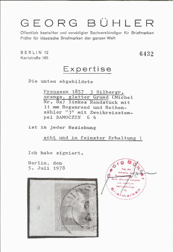 | Zusatzinformationen und Suchstichworte: | 376. Auktion Heinrich Köhler 19.-24. April 2021 Los 165 Glatter Grund 3 Silbergroschen gelborange auf dünnem Papier, farbfrisch und voll- bis breitrandig, links mit ca. 11 mm Bogenrand mit Reihenzäler "8", sauber entwertet durch Doppelkreisstempel "SAMOSCZYN 6 4". Tadellos. Signiert Georg Bühler, Brettl und Kruschel, Fotoattest Wasels BPP (2020) Ausruf 150,00 EUR Zuschlag 360,00 EUR (aus der Sammlung Erivan Haub) |