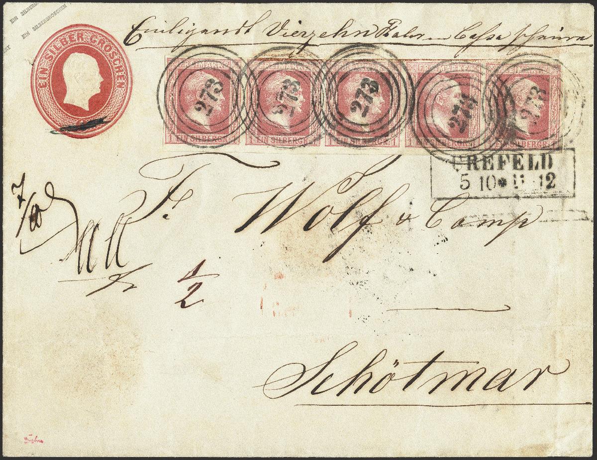 | Zusatzinformationen und Suchstichworte: | 376. Auktion Heinrich Köhler 19.-24. April 2021 Los 168 1 Silbergroschen rosa im waagerechten 5er-Streifen, farbfrisch und voll- bis breitrandig mit Nummer "273" und leicht übergehendem Rahmenstempel "CREFELD 5 10" als Zufrankatur auf Ganzsachenumschlag 1 Silbergroschen rosa als Wertbrief mit 14 Talern in Kassenscheinen nach Schötmar mit Ankunftsstempel. Im Oberrand des Streifens leichte Rotstiftspur und minimale Schürfung, das Kuvert im unteren Drittel gefaltet, sonst einwandfrei. Eine seltene Streifeneinheit, auf Brief haben wir keine größere registriert. Signiert Drahn, Kruschel und W. Engel BPP mit Attest (1982) Ausruf 1.000,00 EUR Zuschlag 1.800,00 EUR (aus der Sammlung Erivan Haub) |