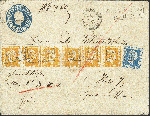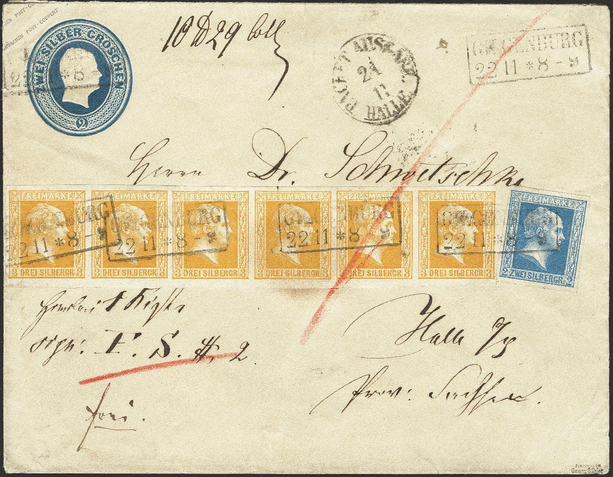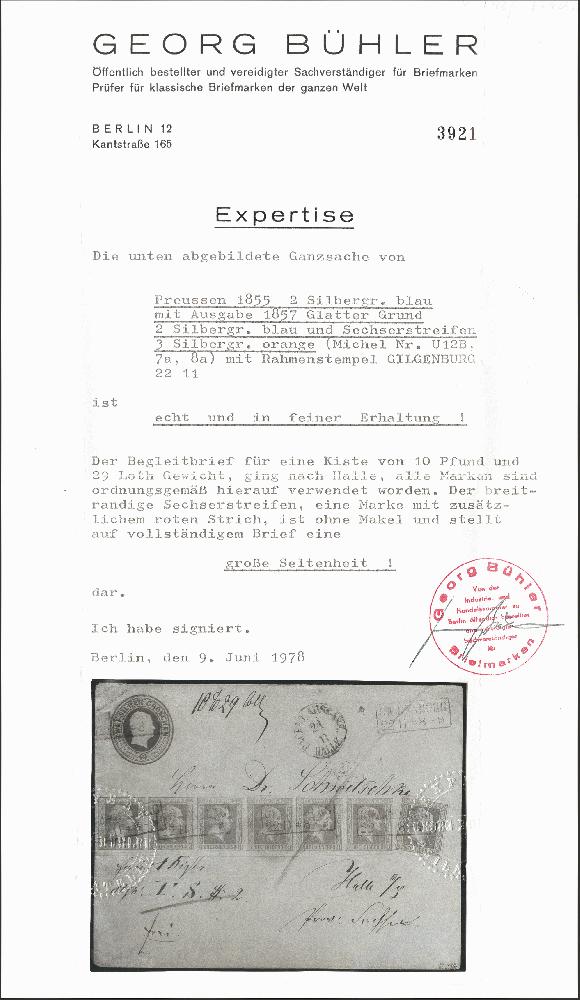| Zusatzinformationen und Suchstichworte: | 376. Auktion Heinrich Köhler 19.-24. April 2021 Los 169 3 Silbergroschen gelborange im waagerechten 6er-Streifen zusammen mit Einzelstück 1 Silbergroschen hellblau als Zufrankatur auf Ganzsachenumschlag 2 Silbergroschen blau im Großformat mit sauber aufgesetzten Rahmenstempeln "GILGENBURG 22 11" als Paketbegleitbrief mit rückseitigem Paketzettel nach Halle mit vorderseitigem "PAKET AUSGABE HALLE 24/11". Die Verschlußklappe in der Brieffaltung gering angetrennt, sonst einwandfreie ursprüngliche Erhaltung. Ein attraktiver Brief mit seltener Streifen-Frankatur; zweitgrößte bekannte Einheit dieser Marke, die wir auf Brief kein weiteres mal registriert haben. Signiert Pfenninger und Georg Bühler mit Fotoattest (1978) Ausruf 3.000,00 EUR Zuschlag 5.000,00 EUR (aus der Sammlung Erivan Haub) |