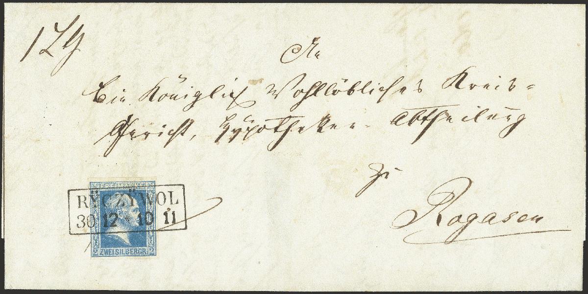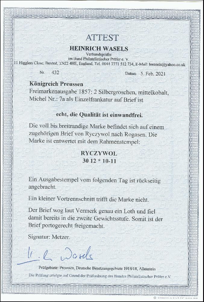 | Zusatzinformationen und Suchstichworte: | 376. Auktion Heinrich Köhler 19.-24. April 2021 Los 170 2 Silbergroschen blau, farbfrisch und noch voll- bis breitrandig mit glasklar übergehend aufgesetztem Rahmenstempel "RYCZYWOL 30 12" (1860) auf Faltbrief der 2. Gewichtsstufe nach Rogasen mit Ausgabestempel. Eine besonders attraktive Einzelfrankatur in einwandfreier Erhaltung. Fotoattest Wasels BPP (2021) Ausruf 200,00 EUR Zuschlag 480,00 EUR (aus der Sammlung Erivan Haub) |