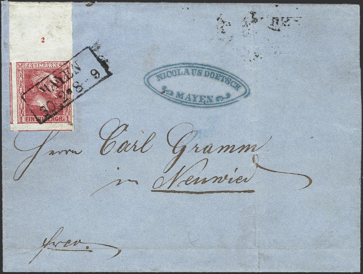 | Zusatzinformationen und Suchstichworte: | 376. Auktion Heinrich Köhler 19.-24. April 2021 Los 179 1 Silbergroschen karminrosa, allseits breit- bis überrandiges Oberrandstück mit Teilen von 3 Nachbarmarken und ca. 20 mm Oberrand mit Reihenzähler "2", sauber entwertet durch Rahmenstempel "MAYEN 30/2" (1861) auf Briefhülle nach Neuwied mit Ausgabestempel. Die Hülle in den Faltungen teils etwas angetrennt und mit 2 Brieffaltungen außerhalb der Frankatur, sonst gute Erhaltung. Ein Ausnahmestück. Fotoattest Kastaun BPP (1984) Ausruf 300,00 EUR Zuschlag 460,00 EUR (aus der Sammlung Erivan Haub) |