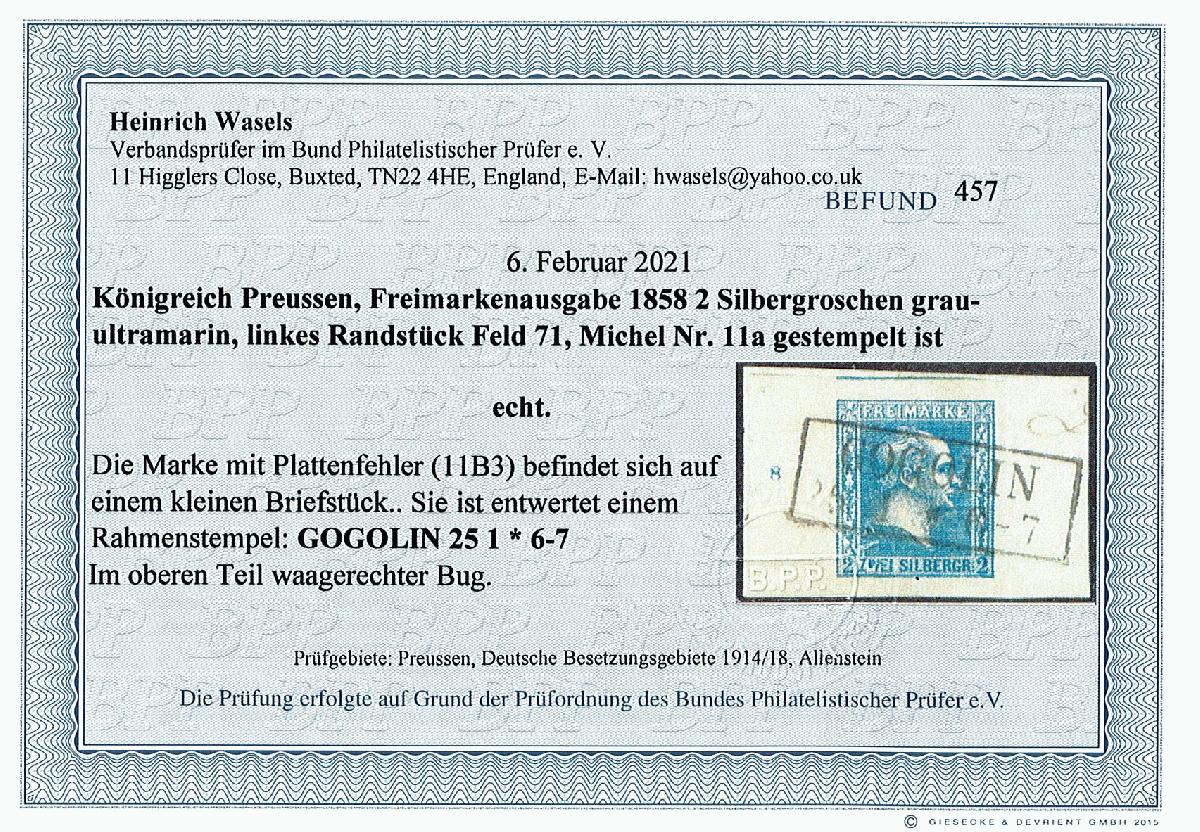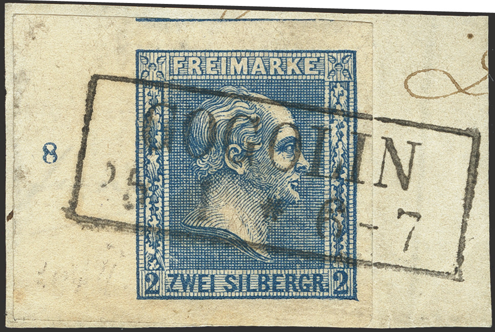 | Zusatzinformationen und Suchstichworte: | 376. Auktion Heinrich Köhler 19.-24. April 2021 Los 180 2 Silbergroschen grauultramarin, allseits breit- bis überrandiges linkes Randstück mit Randziffer "8", mit klar aufgesetztem Rahmenstempel "GOGOLIN 25 1" auf kleinem Briefstück. Im oberen Drittel unauffällige waagerechte Bugspur, sonst einwandfrei, Fotobefund Wasels BPP Ausruf 80,00 EUR (aus der Sammlung Erivan Haub) |