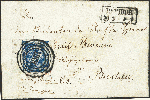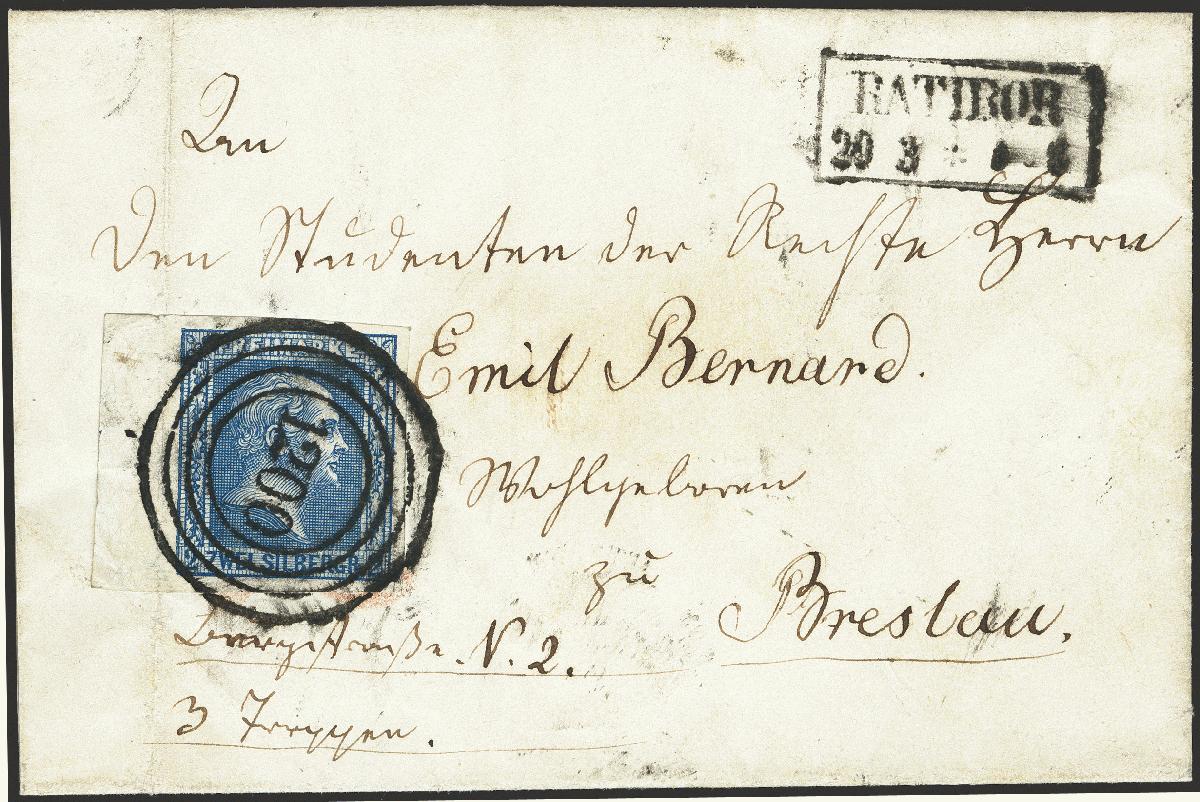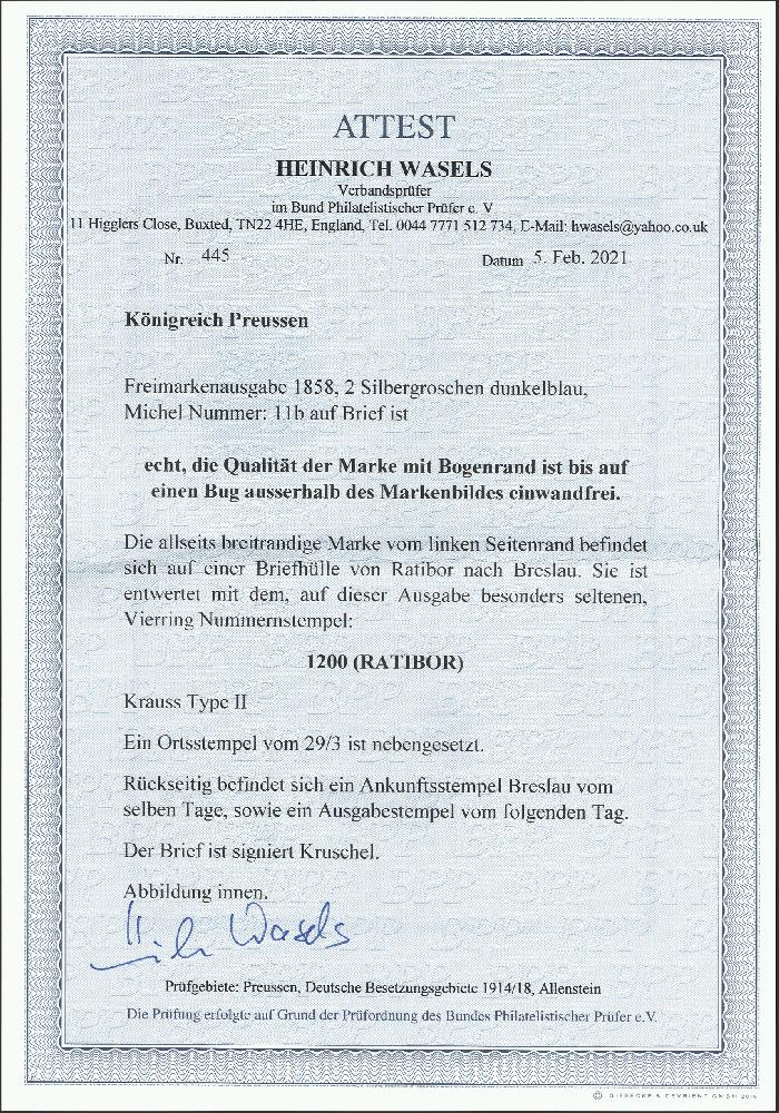 | Zusatzinformationen und Suchstichworte: | 376. Auktion Heinrich Köhler 19.-24. April 2021 Los 185 2 Silbergroschen dunkelblau, allseits breitrandiges linkes Randstück mit ca. 7 mm Bogenrand (hier senkrechte Briefbugspur), mit glasklar aufgesetzter Nummer "1200" und nebengesetztem Rahmenstempel "RATIBOR 20 3" auf kleiner Briefhülle nach Breslau mit rückseitigem Ankunfts- und Ausgabestempel. Schöne und sonst einwandfreie Erhaltung. Da die Nummernstempel zum 31. März 1859 eingezogen wurden und von der 2 Silbergroschen noch Restbestände der Ausgabe 'Glatter Grund' aufgebraucht wurden, sind Nummernstempel-Entwertungen auf dieser Marke außerordentlich selten; es sind nur 3 weitere Ganzstücke registriert, mit der b-Farbe Unikat. Signiert Kruschel und Fotoattest Wasels BPP (2021) Ausruf 2.000,00 EUR Zuschlag 3.600,00 EUR (aus der Sammlung Erivan Haub) |