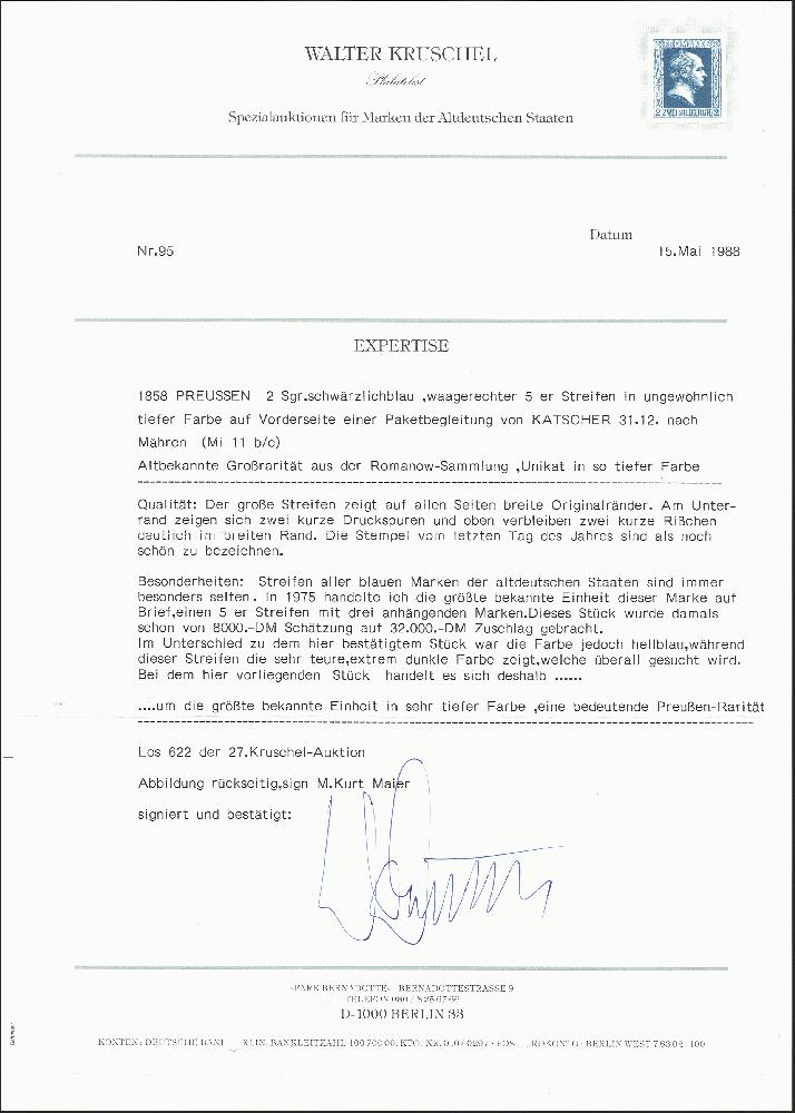 | Zusatzinformationen und Suchstichworte: | 376. Auktion Heinrich Köhler 19.-24. April 2021 Los 186 2 Silbergroschen dunkelblau im waagerechten 5er-Streifen, schöne tiefe frische Farbe, links gut voll- sonst allseits breitrandig, mit Rahmenstempel "KATSCHER 31/12" auf großem Briefteil eines Briefes der 6. Gewichtsstufe nach Kremsier in Mähren, Österreich. Schöne und einwandfreie Erhaltung (2 kleine Randspalte im Oberrand berühren die Markenbilder nicht). Größte bekannte Streifeneinheit dieser Farbnuance und als solche Unikat. Signiert Kruschel und Kurt Maier, Berlin, Fotoattest Wasels BPP (2020) Ausruf 3.000,00 EUR (aus der Sammlung Erivan Haub) |