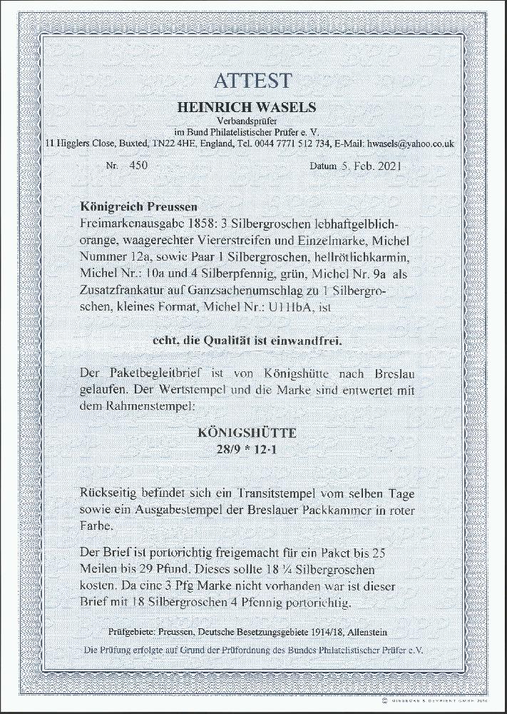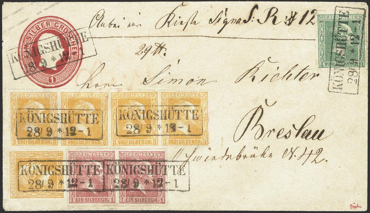| Zusatzinformationen und Suchstichworte: | 376. Auktion Heinrich Köhler 19.-24. April 2021 Los 187 3 Silbergroschen lebhaftgelblichorange, waagerechter 4er-Streifen und Einzelmarke zusammen mit 4 Pfennige dunkelgrün und 1 Silbergroschen rosa im waagerechten Paar, alle farbfrisch und voll- bis breitrandig als Zufrankatur auf Ganzsachenumschlag 1 Silbergroschen rosa mit mehrfach glasklar aufgesetztem Rahmenstempel "KÖNIGSHÜTTE 28/9" als Paketbegleitbrief nach Breslau mit Ankunfts- und Packkammerstempel. Die Ganzsache minimale unbedeutende Beanstandungen, die Frankatur tadellos und in besonders schöner und frischer Erhaltung (amtliche Rotstiftspuren leicht abgeschwächt). Eine der attraktivsten Farbfrankaturen dieser Ausgabe. Signiert Friedl, Wien, Drahn und Kruschel, Fotoattest Wasels BPP (2021) Ausruf 2.000,00 EUR Zuschlag 32.000,00 EUR (aus der Sammlung Erivan Haub) |