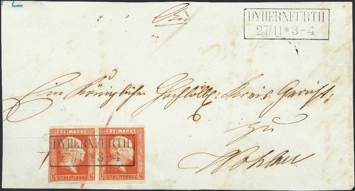 | Zusatzinformationen und Suchstichworte: | 376. Auktion Heinrich Köhler 19.-24. April 2021 Los 188 ½ Silbergroschen rotorange im waagerechten Paar mit 'weitem Abstand', sehr schön farbfrisch und allseits voll- bis breitrandig, links mit etwa der Hälfte der Randlinie der Nachbarmarke (hier der 'enge Abstand' sehr schön sichtbar), mit glasklar auf- und nebengesetztem Rahmenstempel "DYHERNFURTH 27/11" auf Briefvorderseite nach Wohlau. Ein besonders schönes Ganzstück mit dieser seltenen Abart in ganz ursprünglicher Erhaltung. Signiert Metzer und Kruschel, Fotoattest Wasels BPP (2021) Ausruf 2.000,00 EUR Zuschlag 3.200,00 EUR (aus der Sammlung Erivan Haub) |