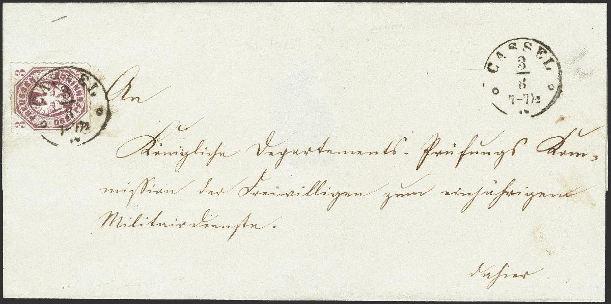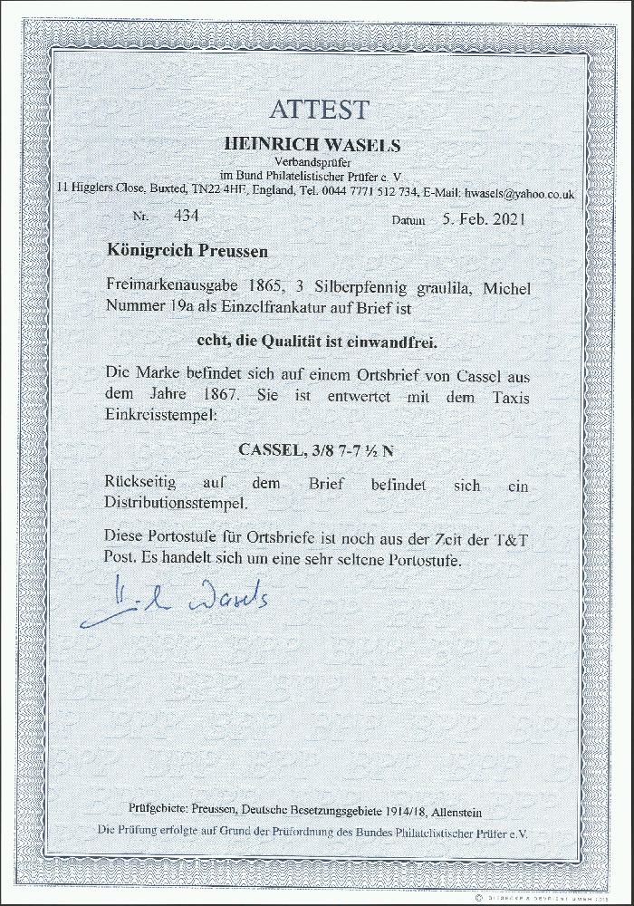 | Zusatzinformationen und Suchstichworte: | 376. Auktion Heinrich Köhler 19.-24. April 2021 Los 216 3 Pfennige graulila, farbfrisch und gut durchstochen mit sauber auf- und nebengesetztem Taxis-Einkreisstempel "CASSEL 3/8" (1867) auf Ortsbriefhülle an die königliche Prüfungskommission für Militär-Freiwillige. Ein sehr attraktiver und seltener Brief in einwandfreier Erhaltung. 3 Pfennig-Einzelfrankaturen gibt es portogerecht nur aus dem ehemaligen Königreich Hannover und dem ehemaligen Postgebiet von Thurn und Taxis bei denen einige alte Portosätze beibehalten wurden; die Verwendung einer 3 Pfennig graulila im Thurn und Taxis-Gebiet ist außerordentlich selten. Fotoattest Wasels BPP (2021) Ausruf 1.000,00 EUR Zuschlag 1.200,00 EUR (aus der Sammlung Erivan Haub) |