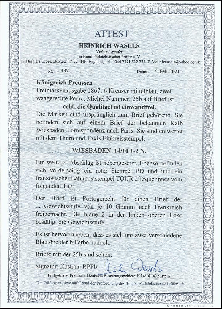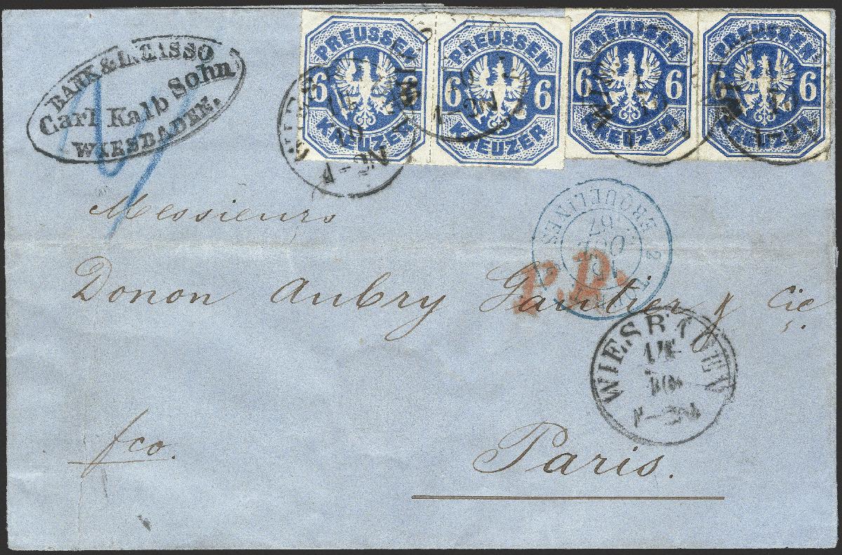 | Zusatzinformationen und Suchstichworte: | 376. Auktion Heinrich Köhler 19.-24. April 2021 Los 224 6 Kreuzer preußischblau, 2 waagerechte Paare in unterschiedlichen Nuancen, farbfrisch und gut durchstochen mit Taxis-Einkreisstempel "WIESBADEN 14/10" (1867) auf Briefhülle der 2. Gewichtsstufe nach Paris. Ein attraktiver Brief mit seltener Mehrfachfrankatur, wir haben keine höhere registriert. Fotoatteste Kastaun BPP (1985) und Wasels BPP (2021) Ausruf 1.500,00 EUR Zuschlag 4.600,00 EUR (aus der Sammlung Erivan Haub) |