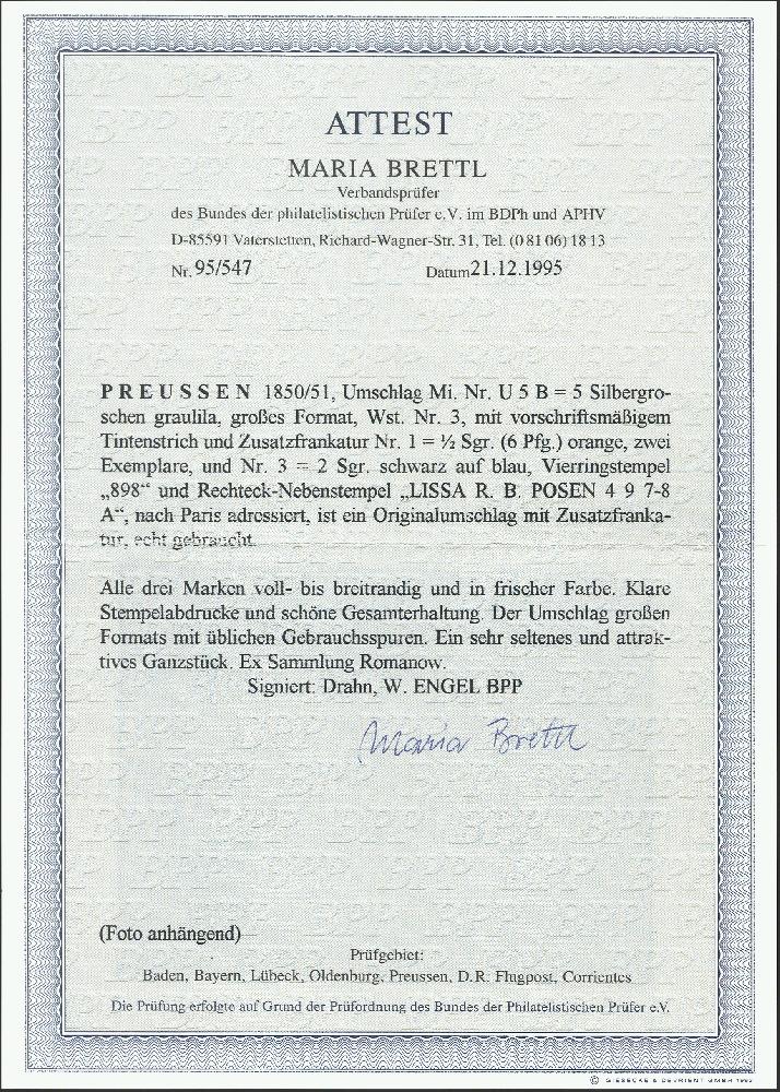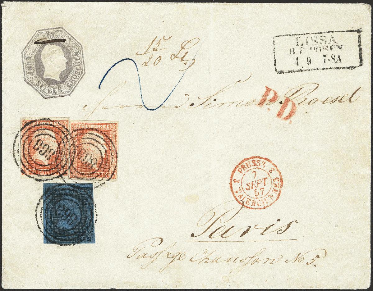 | Zusatzinformationen und Suchstichworte: | 376. Auktion Heinrich Köhler 19.-24. April 2021 Los 228 Oktogon-Umschlag 5 Silbergroschen graulila im Großformat, Schilling Nr. 3, mit Zufrankatur 1850, ½ Silbergroschen rotorange, 2 Einzelwerte und 2 Silbergroschen schwarz auf blau, alle farbfrisch und voll- bis breitrandig mit jeweils klar aufgesetzter Nummer "898", mit nebengesetztem Rahmenstempel "LISSA R.B. POSEN 4 9" (1857) als Brief der 2. Gewichtsstufe nach Paris. Das Kuvert leicht gereinigt und Faltspuren geglättet, sonst schöne Gesamterhaltung. Ein attraktiver Auslandsbrief. Signiert Drahn, Kruschel, Metzer und W. Engel BPP, Fotoattest Brettl BPP (1995) Ausruf 500,00 EUR Zuschlag 2.900,00 EUR (aus der Sammlung Erivan Haub) |