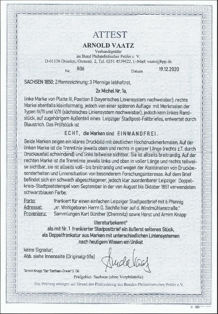| Zusatzinformationen und Suchstichworte: | 376. Auktion Heinrich Köhler 19.-24. April 2021 Los 260 1850, 3 Pfennig ziegelrot, 2 Einzelwerte, einmal Platte III, Feld 8, einmal Platte IV oder V, Feld 11, beide farbfrisch und voll- bis breitrandig, bei der links klebenden Marke bayerisches, bei der rechts klebenden sächsisches Liniensystem nachweisbar, beide entwertet durch Blaustrich, als portogerechte Frankatur auf kleiner Stadtpost-Briefhülle mit schwach nebengesetztem blauen Doppelkreisstempel von Leipzig. Die Verwendung der Nr. 1 auf Stadtpostbrief ist außerordentlich selten, wir haben lediglich 3 weitere Belege registriert, darüber hinaus ist dies die bisher einzig registrierte gemeinschaftliche Verwendung einer Marke im bayerischen Liniensystem mit einer Marke im sächsischen Liniensystem. Ein altbekannter und einmaliger Brief in einwandfreier und ursprünglicher Erhaltung. Fotoattest Vaatz BPP (2020) Ausruf 10.000,00 EUR Zuschlag 14.000,00 EUR (aus der Sammlung Erivan Haub) |