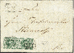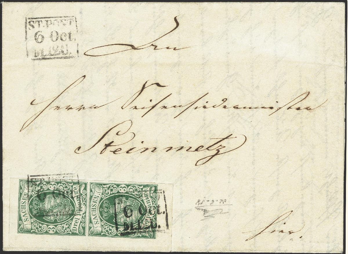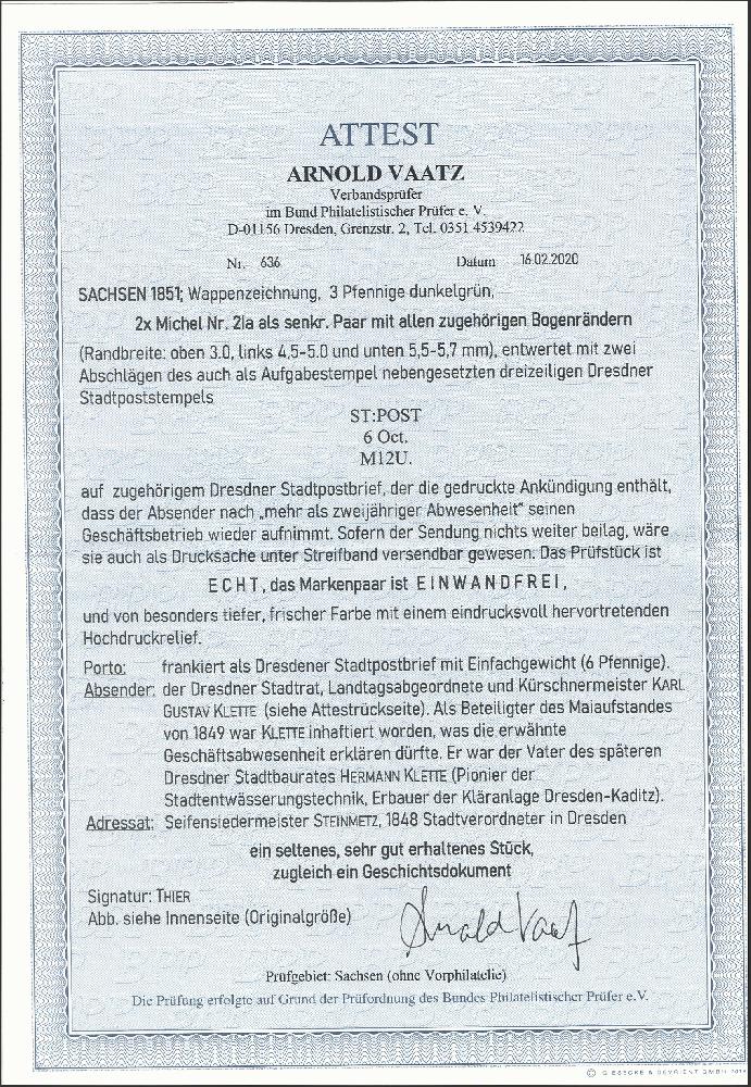| Zusatzinformationen und Suchstichworte: | 376. Auktion Heinrich Köhler 19.-24. April 2021 Los 261 1851, Wappen 3 Pfennige dunkelgrün im senkrechten Paar vom linken Bogenrand, sehr schön farbfrisch und allseits breitrandig mit 3/5,7 mm Bogenrändern an 3 Seiten, mit sauber auf- und nebengesetztem Rahmenstempel "ST.POST 6 Oct. M12U." auf vollständigem Dresdener Stadtpostbrief mit gedruckter Geschäftsankündigung. Besonders schöne und einwandfreie Erhaltung. Fotoattest Vaatz BPP (2020) Im Inhalt kündigt der Absender, der Kürschner-Meister, Dresdner Stadtrat und Landtagsabgeordnete Karl Gustav Klette an, dass er "nach mehr als zweijähriger Abwesenheit" seinen Geschäftsbetrieb wieder aufnimmt. Klette war als Beteiligter des Maiaufstandes von 1849 inhaftiert worden, was die erwähnte Geschäftsabwesenheit erklären dürfte. Ausruf 1.000,00 EUR Zuschlag 6.000,00 EUR (aus der Sammlung Erivan Haub) |
