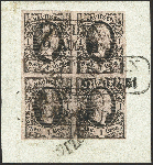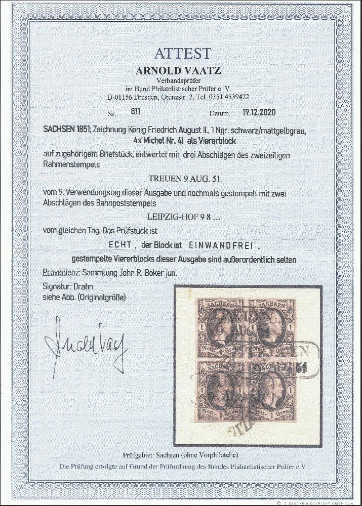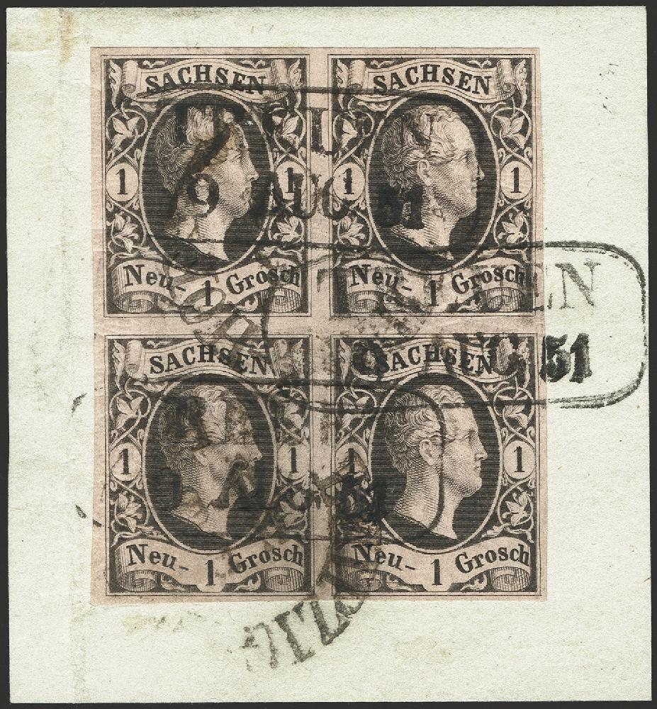 | Zusatzinformationen und Suchstichworte: | 376. Auktion Heinrich Köhler 19.-24. April 2021 Los 262 1851, Friedrich August 1 Neugroschen auf mattgelbgrau, Type I, im 4er-Block, farbfrisch und allseits voll- bis breitrandig mit Doppelentwertung durch Rahmenstempel "TREUEN 9 AUG. 51" und Bahnpost-Kreisstempel "LEIPZIG-HOF 9 8" auf Briefstück. Ein attraktiver und äußerst seltener Block mit sehr früher Verwendung; wir haben keinen weiteren Viererblock mit Ortsstempel registriert. Signiert Drahn und Fotoattest Vaatz BPP (2020) Ausruf 1.500,00 EUR Zuschlag 2.200,00 EUR (aus der Sammlung Erivan Haub) |