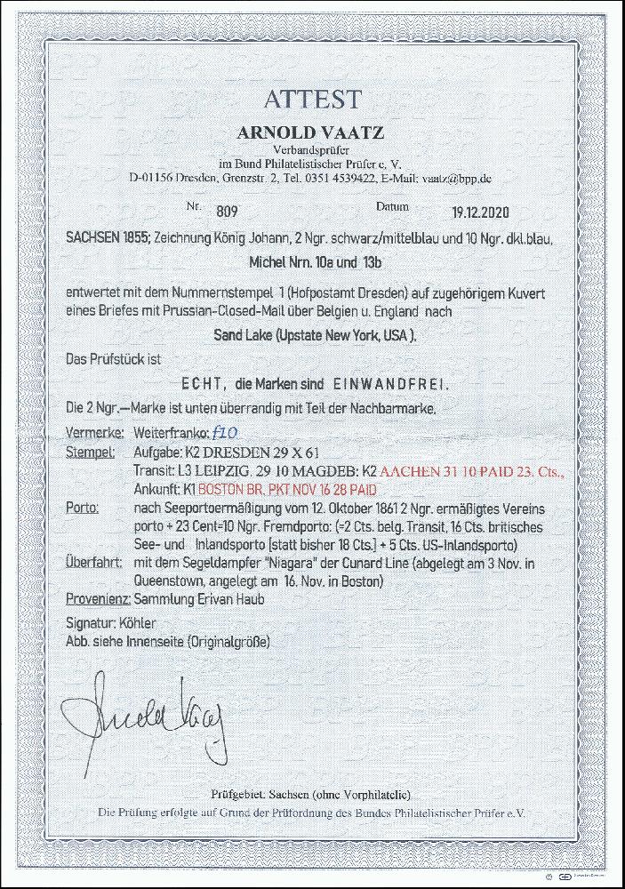 | Zusatzinformationen und Suchstichworte: | 376. Auktion Heinrich Köhler 19.-24. April 2021 Los 265 1856/63, 10 Neugroschen dunkelblau und 2 Neugroschen schwarz auf dunkelblau, beide farbfrisch und voll- bis breitrandig, die 2 Neugroschen mit kleinem Teil der oberen Nachbarmarke, mit jeweils klar aufgesetzter Nummer "1" und nebengesetztem Doppelkreisstempel "DRESDEN 29/X 61" auf Briefkuvert über die 'Prussian Closed Mail' nach Sand Lake im Staate New York mit vorderseitigem "BOSTON BR.PKT. 28 PAID". Die 10 Neugroschen oben ganz kleiner Knitter, sonst einwandfreie und attraktive Erhaltung. Signiert H. Köhler und Fotoattest Vaatz BPP (2020) Ausruf 1.000,00 EUR Zuschlag 2-.300,00 EUR (aus der Sammlung Erivan Haub) |