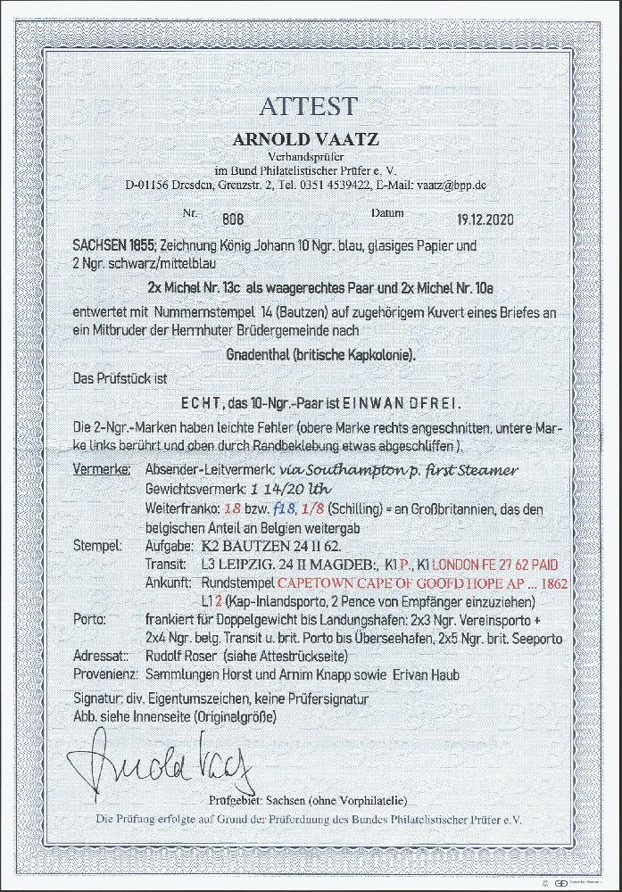 | Zusatzinformationen und Suchstichworte: | 376. Auktion Heinrich Köhler 19.-24. April 2021 Los 266 1856/63, 10 Neugroschen blau auf glasigem Papier im waagerechten Paar, farbfrisch und voll- bis breitrandig, unten mit Teil einer Nachbarmarke, zusammen mit 2 leicht berührten bzw. etwas angeschnittenen 2 Neugroschen auf blau, mit Nummer "11" und nebengesetztem Doppelkreisstempel "BAUTZEN 24/II 62" auf Briefkuvert der 2. Gewichtsstufe über Preußen, Belgien und England nach Gnadenthal am Kap der Guten Hoffnung. Der Brief ist portogerecht frankiert mit 6 Neugroschen Vereinsporto, 8 Neugroschen britischem Porto und belgischem Transit sowie 10 Neugroschen britischem Seeporto bis zum Landungshafen; das Kap'sche Inlandsporto von "2" Pence wurde vom Empfänger eingezogen. Ein insbesondere für diese exotische Destination außerordentlich frischer und attraktiver Brief. Fotoattest Vaatz BPP (2020) Ausruf 10.000,00 EUR Zuschlag 14.000,00 EUR (aus der Sammlung Erivan Haub) |