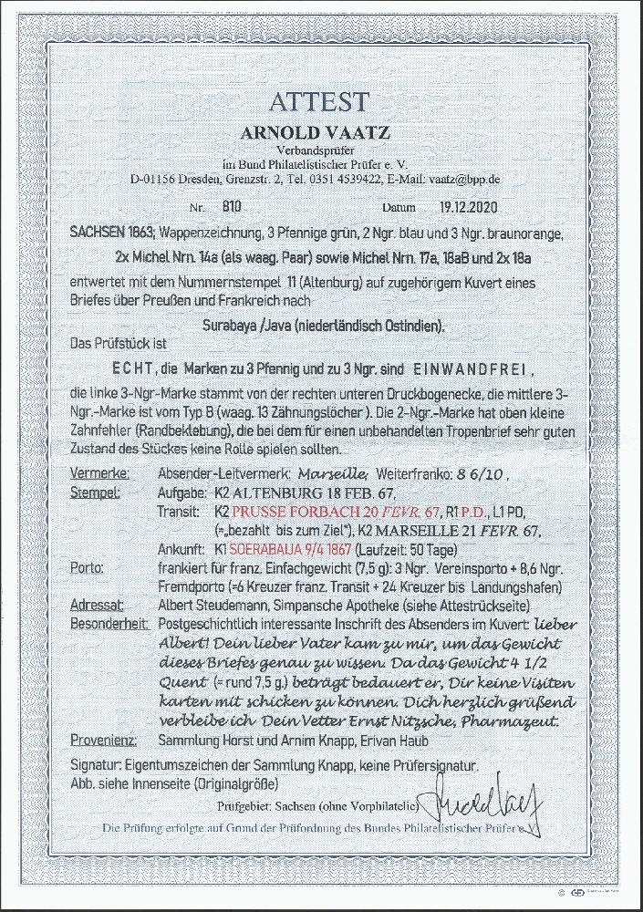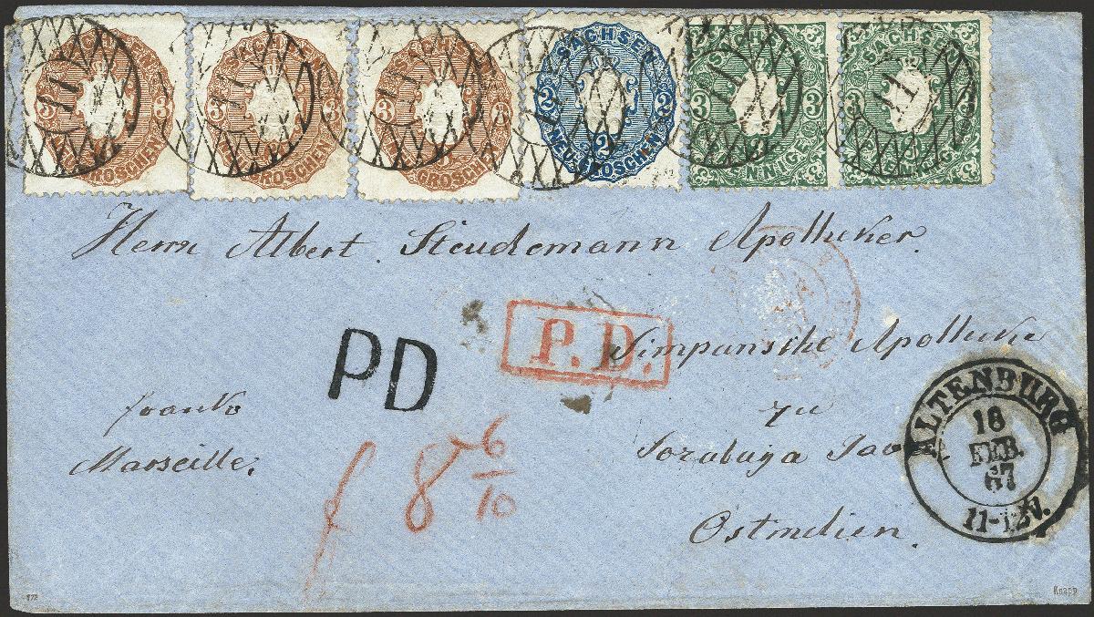 | Zusatzinformationen und Suchstichworte: | 376. Auktion Heinrich Köhler 19.-24. April 2021 Los 267 1863/67, Wappen 3 Pfennig grün im waagerechten Paar mit 2 Neugroschen blau und 3 Einzelwerten 3 Neugroschen braunorange, als Streifen geklebt mit Nummer "11" und sauber nebengesetztem Doppelkreisstempel "ALTENBURG 18 FEB. 67" auf Briefkuvert über Frankreich nach Soerabaija auf Java, Niederländisch Indien. Die 2 Groschen oben durch Randklebung gering fehlerhaft und eine 3 Groschen dort leichte Bugspur, sonst - insbesondere für diese seltene Destination - sehr schöne frische und ursprüngliche Erhaltung. Ein attraktiver und seltener Brief aus der bekannten Korrespondenz an den aus Altenburg stammenden Apother Steudemann. Fotoattest Vaatz BPP (2020) Ausruf 3.000,00 EUR Zuschlag 6.500,00 EUR (aus der Sammlung Erivan Haub) |