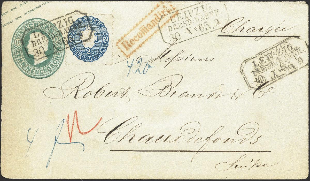 | Zusatzinformationen und Suchstichworte: | 376. Auktion Heinrich Köhler 19.-24. April 2021 Los 268 1859, Umschlag 10 Neugroschen grün mit Zufrankatur Wappen 2 Neugroschen blau, farbfrisch und gut gezähnt, mit sauber übergehend aufgesetztem und zusätzlich zweimal nebengesetztem Rahmenstempel "LEIPZIG DRESD:BAHNH. 30 IX*65" als Chargé-Brief der 2. Gewichtsstufe nach Chaux de Fonds in der Schweiz mit Transit- und Ankunftsstempeln. Das Porto setzt sich zusammen aus 6 Neugroschen Vereinsporto, 4 Neugroschen Schweizer Anteil und 2 Neugroschen Chargé-Gebühr. Das Kuvert ganz minimale Randtönung, sonst einwandfrei. Der 10 Neugroschen-Umschlag ist in gebrauchter Erhaltung eine große Seltenheit, es sind insgesamt nur 6 Stück bekannt. Ein außerordentlich attraktives Stück. Fotoattest Vaatz BPP (2020) Ausruf 10.000,00 EUR Zuschlag 10.500,00 EUR (aus der Sammlung Erivan Haub) |