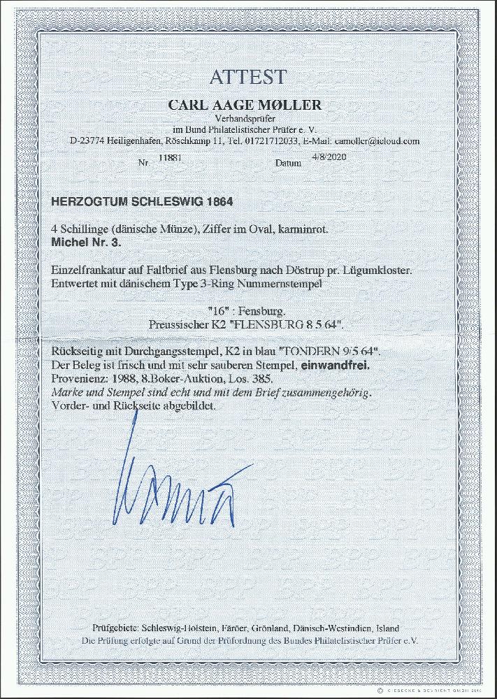 | Zusatzinformationen und Suchstichworte: | 376. Auktion Heinrich Köhler 19.-24. April 2021 Los 273 4 Schilling karminrot, farbfrisch und gut durchstochen mit Nummer "16" auf komplettem Faltbrief mit nebengesetztem Doppelkreisstempel "FLENSBURG 8 5 64" nach Döstrup bei Lügumkloster mit rückseitigem Durchgangsstempel von Tondern. Die Marke an den Rand geklebt aber einwandfrei. Fotoattest Moeller BPP (2020) Ausruf 300,00 EUR Zuschlag 1.000,00 EUR (aus der Sammlung Erivan Haub) |
