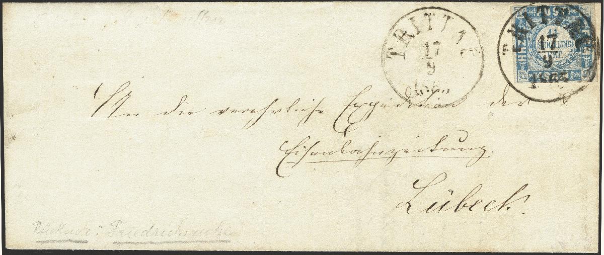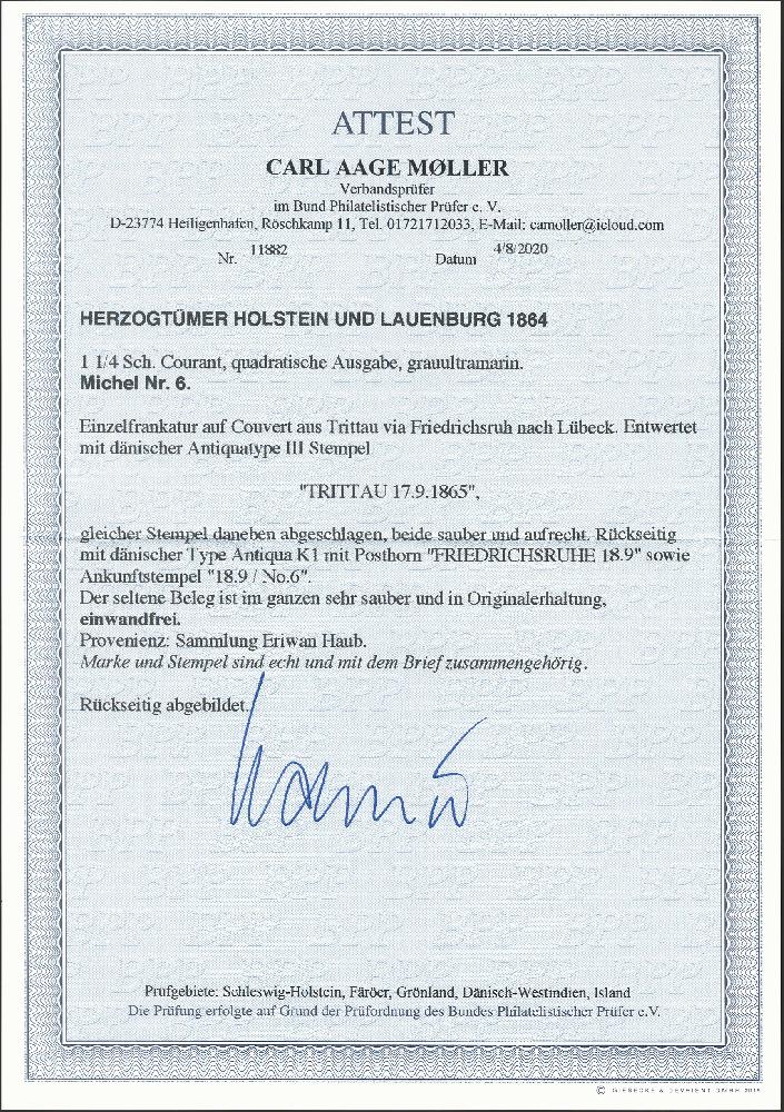| Zusatzinformationen und Suchstichworte: | 376. Auktion Heinrich Köhler 19.-24. April 2021 Los 274 1864, "HRZGL" 1¼ Schilling grauultramarin, voll- bis breitrandig mit sauber auf- und nebengesetztem dänischen Einkreisstempel "TRITTAU 17/9 1865" auf kleiner Briefhülle nach Lübeck mit Durchgangsstempel "FRIEDRICHSRUHE 18/9" (mit Posthorn) und Distributionsstempel. Die Marke minimale Druckspur im oberen Viertel, sonst einwandfrei. Fotoattest Moeller BPP (2020) Ausruf 150,00 EUR Zuschlag 340,00 EUR (aus der Sammlung Erivan Haub) |