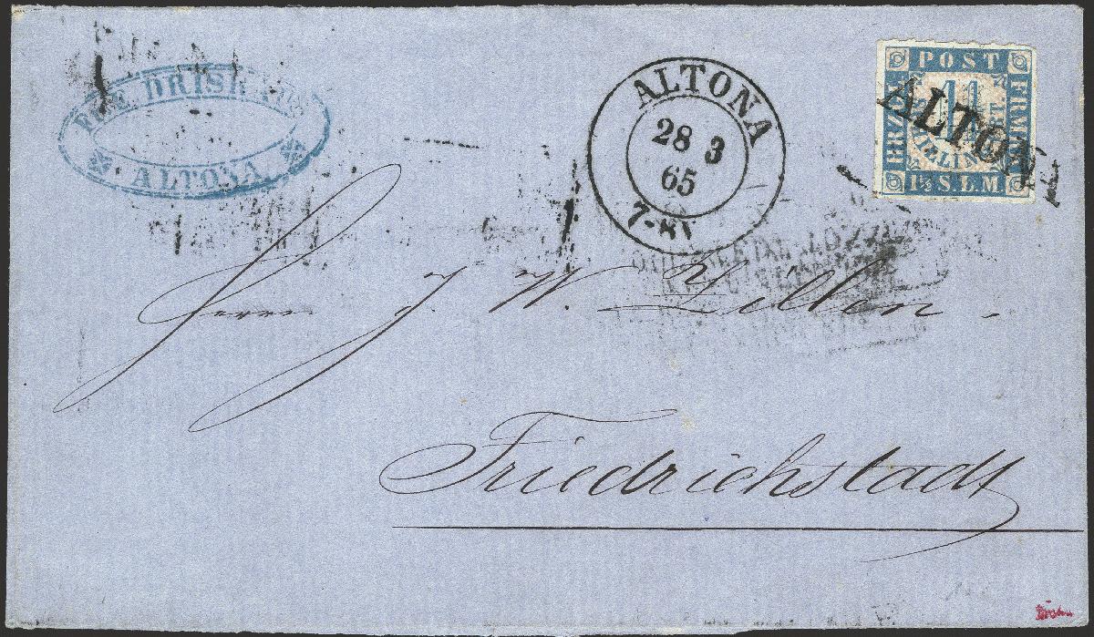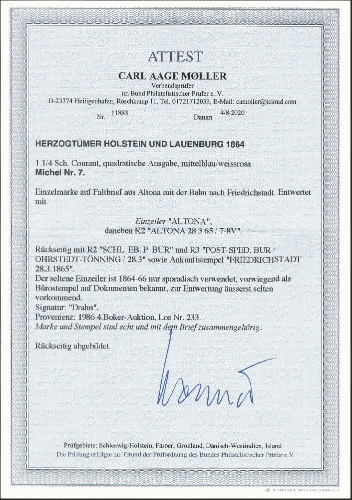 | Zusatzinformationen und Suchstichworte: | 376. Auktion Heinrich Köhler 19.-24. April 2021 Los 275 1864, Wertangabe im Quadrat 1¼ Schilling mittelblau/weißrosa, farbfrisch und gut durchstochen, mit sauberem einzeiligem Langstempel "ALTONA" auf Briefhülle (obere und untere Seitenklappe fehlend) mit nebengesetztem Doppelkreisstempel "ALTONA 28 3 65" nach Friedrichstadt mit Bahnpost- und Ankunftsstempeln. Der Langstempel war ein Innendienststempel, der jedoch zwischen 1864 und 1866 sporadisch als Entwerter verwendet wurde. Signiert Drahn und Fotoattest Moeller BPP (2020) Ausruf 500,00 EUR Zuschlag 1.200,00 EUR (aus der Sammlung Erivan Haub) |