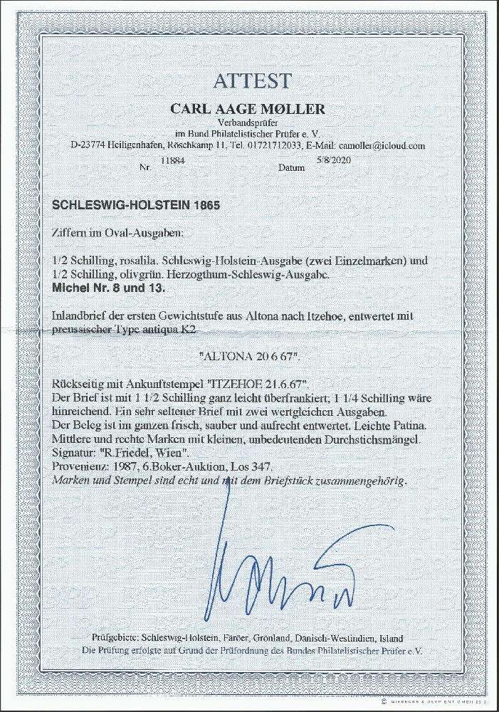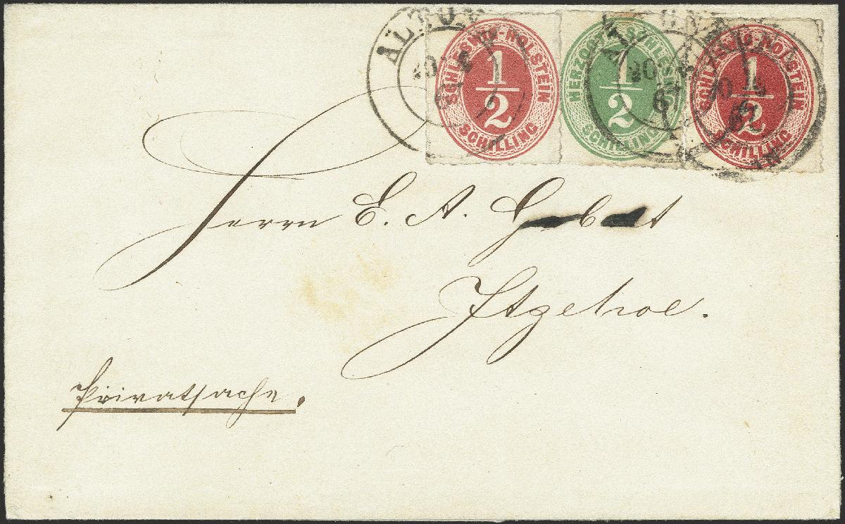 | Zusatzinformationen und Suchstichworte: | 376. Auktion Heinrich Köhler 19.-24. April 2021 Los 276 1865/67, HERZOGTH. SCHLESWIG ½ Schilling grün in Mischfrankatur mit 1865, SCHLESWIG-HOLSTEIN ½ Schilling rosalila, 2 Einzelwerte in unterschiedlichen Nuancen, abwechselnd geklebt, mit Doppelkreisstempel "ALTONA 20 6 67" auf Briefhülle nach Itzehoe mit Ankunftsstempel vom nächsten Tag. Die Frankatur mit unwesentlichen Durchstichfehlern, sonst einwandfrei. Der Brief ist in Ermangelung kleinerer Wertstufen um ¼ Schilling überfrankiert. Eine sehr attraktive und in dieser Form wohl einmalige Aufbrauchsfrankatur. Signiert Friedl, Wien und Fotoattest Moeller BPP (2020) Ausruf 1.000,00 EUR Zuschlag 3.400,00 EUR (aus der Sammlung Erivan Haub) |