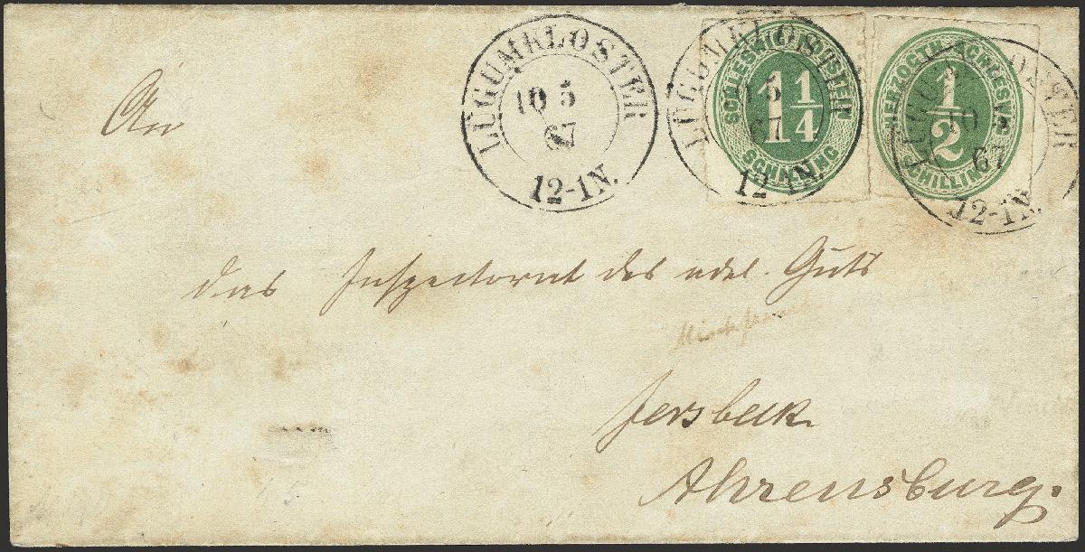 | Zusatzinformationen und Suchstichworte: | 376. Auktion Heinrich Köhler 19.-24. April 2021 Los 279 1¼ Schilling grün in Mischfrankatur mit 1865/67, ½ Schilling grün, mit sauber auf- und nebengesetztem Doppelkreisstempel "LÜGUMKLOSTER 10 5 67" auf kleiner Briefhülle nach Jersbeck bei Arensburg mit rückseitigem Durchgangsstempel von Bargteheide. Eine ganz ungewöhnliche und seltene Frankatur mit vorausbezahltem Bestellgeld. Die Hülle leichte Patina, sonst einwandfrei Ausruf 1.000,00 EUR Zuschlag 1.000,00 EUR (aus der Sammlung Erivan Haub) |