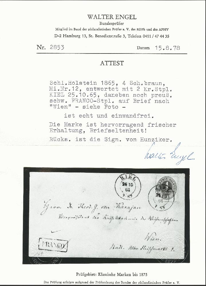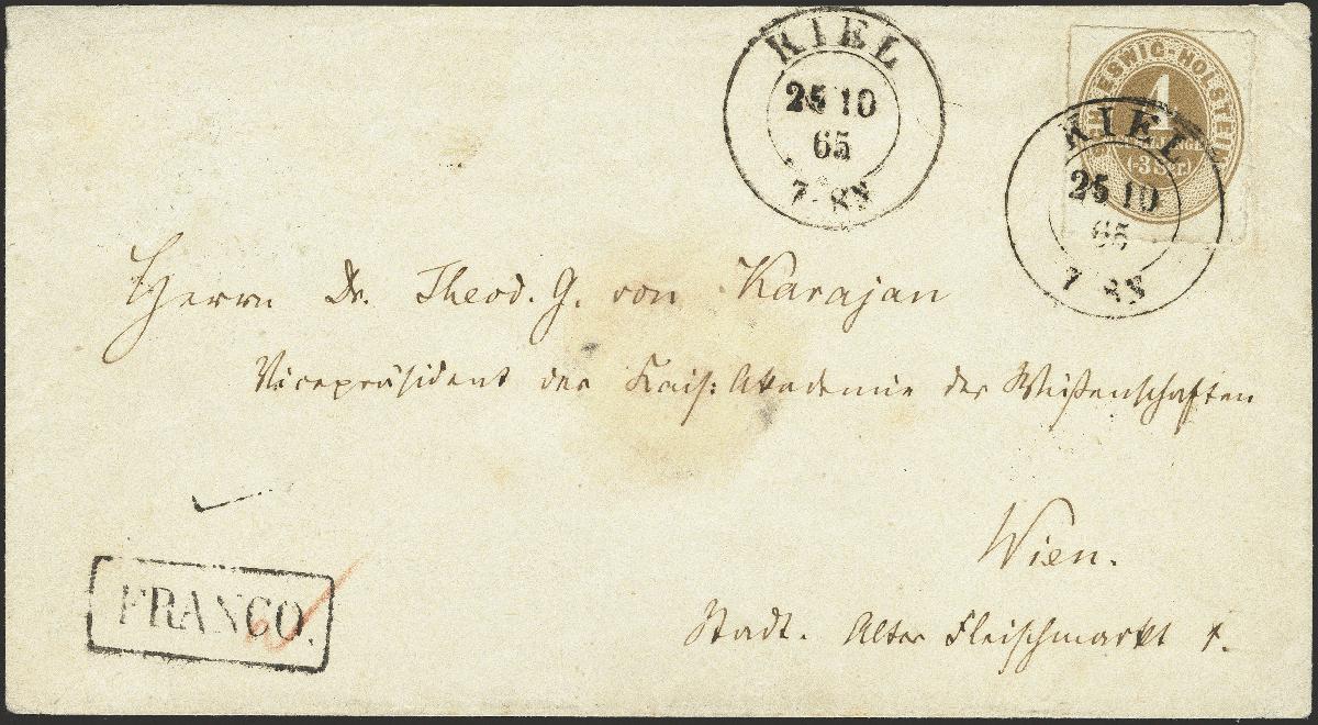 | Zusatzinformationen und Suchstichworte: | 376. Auktion Heinrich Köhler 19.-24. April 2021 Los 281 1865, SCHLESWIG-HOLSTEIN 4 Schilling hellockerbraun, farbfrisch und einwandfrei durchstochen mit sauber auf- und nebengesetztem preußischen Doppelkreisstempel "KIEL 25 10 65" auf Briefkuvert mit Nebenstempel "FRANCO" an "Dr. Theod. G. von Karajan, Vizepräsident der kais. Akademie der Wissenschaften, Wien" mit rückseitigem Bahnpoststempel "HAMBURG / BERLIN" und Ankunftsstempel vom 28.10. Diese Marke ist auf Brief außerordentlich selten; von den 12 in der Köhler-Kartei registrierten Stücken sind die meisten fehlerhaft oder restauriert. Ein besonders attraktiver Brief im Wechselverkehr mit Österreich an prominente Adresse. Ausruf 20.000,00 EUR Zuschlag 26.000,00 EUR (aus der Sammlung Erivan Haub) |