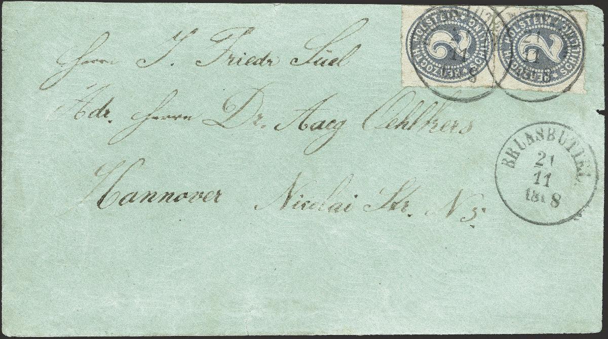 | Zusatzinformationen und Suchstichworte: | 376. Auktion Heinrich Köhler 19.-24. April 2021 Los 283 2 Schiling grauultramarin im senkrechten Paar (leichte Aufklebe-Stauchung im zwischenliegenden Durchstich), farbfrisch und gut durchstochen mit Einkreisstempel in dänischer Type "BRUNSBÜTTEL 21/11 1868" (falsch eingestellte Jahreszahl) auf Briefkuvert nach Hannover mit Ankunftsstempel vom nächsten Tag. Das Kuvert kleine Randmängel, sonst einwandfrei. Signiert Friedl, Wien und Weiergang, Fotoattest Moeller BPP (2020) Ausruf 300,00 EUR Zuschlag 900,00 EUR (aus der Sammlung Erivan Haub) |