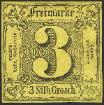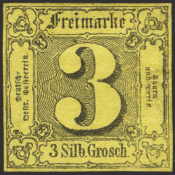 | Zusatzinformationen und Suchstichworte: | 376. Auktion Heinrich Köhler 19.-24. April 2021 Los 286 3 Silbergroschen schwarz auf gelb in schöner tiefer Farbe, allseits voll- bis breitrandig, ungebraucht mit teils leicht verlaufendem Originalgummi. Ein schönes Stück dieser ungebraucht sehr seltenen Marke. Fotoattest Sem BPP (2020) Ausruf 200,00 EUR Zuschlag 380,00 (aus der Sammlung Erivan Haub) |