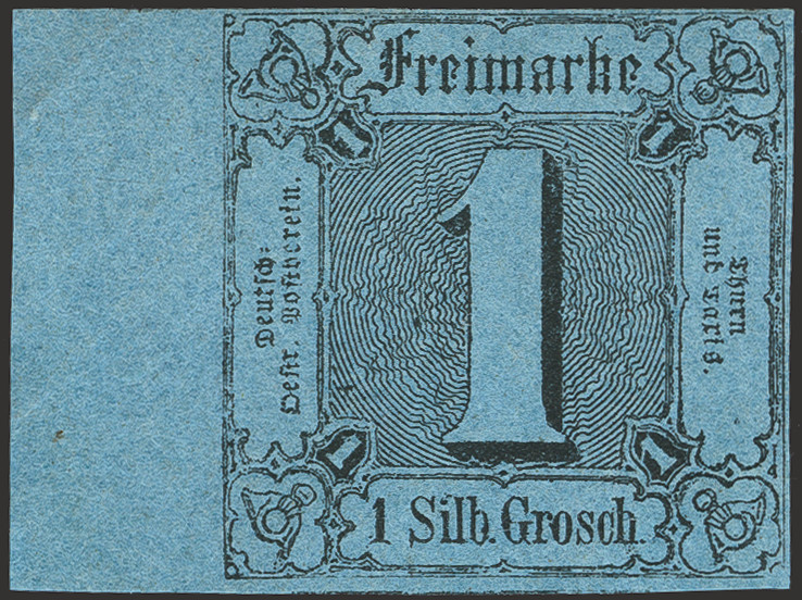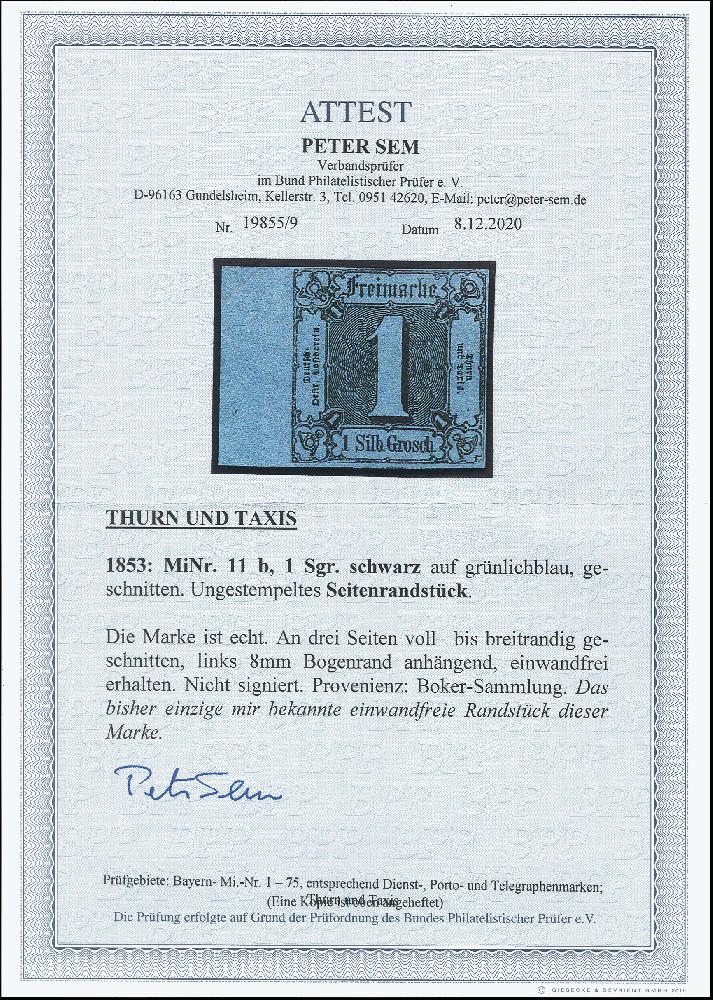 | Zusatzinformationen und Suchstichworte: | 376. Auktion Heinrich Köhler 19.-24. April 2021 Los 287 1 Silbergroschen schwarz auf grünlichblau, linkes Randstück, voll- bis breitrandig, links mit 8 mm Bogenrand, ungebraucht ohne Gummi. Eine in ungebrauchter Erhaltung sehr seltene Marke und laut neuem Fotoattest Sem BPP das einzige ihm bekannte einwandfreie Randstück dieser Marke Ausruf 500,00 EUR Zuschlag 3.200,00 EUR (aus der Sammlung Erivan Haub) |