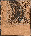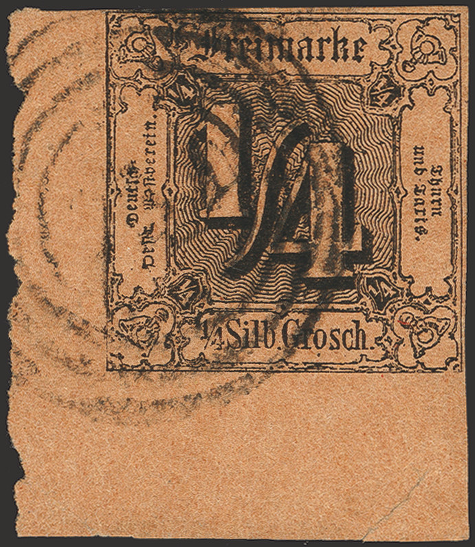 | Zusatzinformationen und Suchstichworte: | 376. Auktion Heinrich Köhler 19.-24. April 2021 Los 289 1852/58, ¼ Silbergroschen schwarz auf braunrot, linke untere Bogenecke, voll- bis breitrandig mit 5/10 mm Bogenrändern, entwertet durch Nummernstempel; im äußeren Unterrand rechts kleiner Einriß verklebt, sonst tadellos. Bogenecken dieser Größe sind außerordentlich selten. Fotoattest Sem BPP (2020) Ausruf 400,00 EUR Zuschlag 700,00 EUR (aus der Sammlung Erivan Haub) |