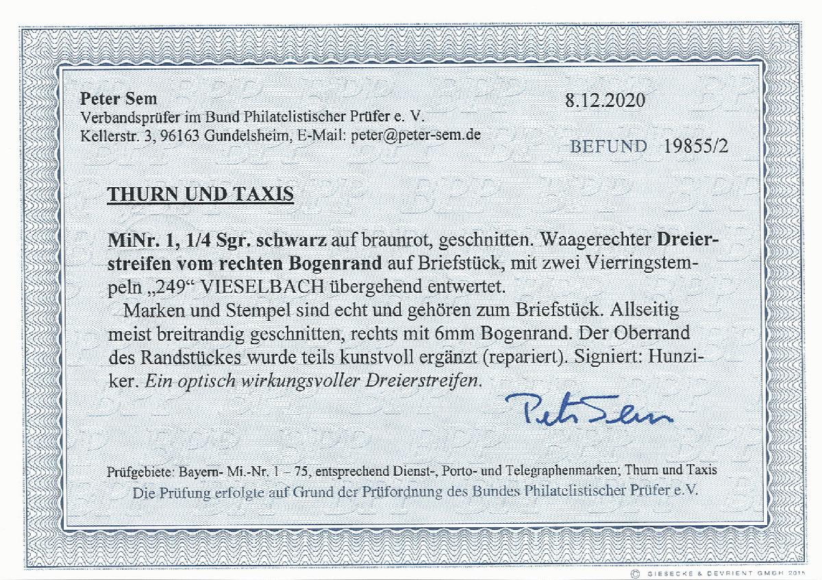 | Zusatzinformationen und Suchstichworte: | 376. Auktion Heinrich Köhler 19.-24. April 2021 Los 290 ¼ Silbergroschen schwarz auf braunrot im waagerechten 3er-Streifen vom rechten Bogenrand, farbfrisch und meist voll- bis sehr breitrandig mit ca. 6 mm Bogenrand, mit leicht aufgesetzter Nummer "249" VIESELBACH auf kleinem Briefstück. Der rechte obere Rand der rechten Marke kunstvoll ergänzt, sonst einwandfrei. Eine attraktive Einheit. Signiert Hunziker mit Fotoattest (1963) und Fotobefund Sem BPP (2020) Ausruf 150,00 EUR Zuschlag 300,00 EUR (aus der Sammlung Erivan Haub) |
