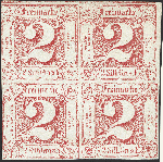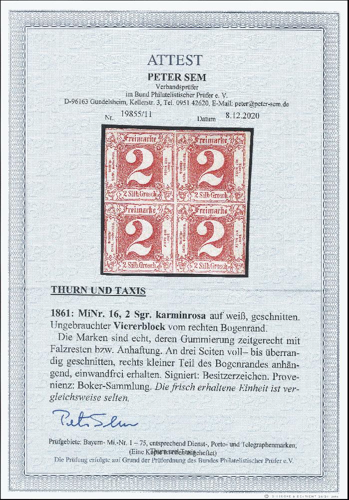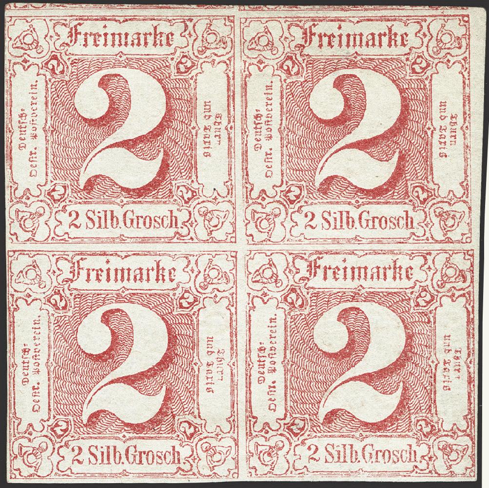 | Zusatzinformationen und Suchstichworte: | 376. Auktion Heinrich Köhler 19.-24. April 2021 Los 296 2 Silbergroschen karminrosa im 4er-Block, sehr schön farbfrisch und allseits voll- bis überrandig, oben mit Teilen von 2 Nachbarmarken und rechts mit kleinem Teil des Bogenrandes, ungebraucht mit Originalgummi, tadellos. Wir haben nur 3 weitere Blockstücke dieser Marke registriert (ein 4er- und zwei 6er-Blocks), von diesen ist der hier angebotene qualitativ bei weitem der beste. Kleine private Signatur, Fotoattes Sem BPP (2020) Ausruf 1.000,00 EUR Zuschlag 1.300,00 EUR (aus der Sammlung Erivan Haub) |