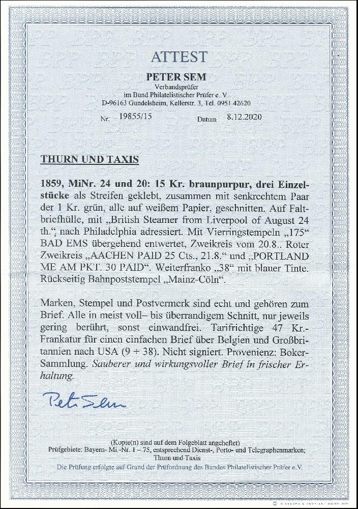 | Zusatzinformationen und Suchstichworte: | 376. Auktion Heinrich Köhler 19.-24. April 2021 Los 300 15 Kreuzer braunpurpur, 3 Einzelstücke, mit senkrechtem Paar 1 Kreuzer grün, als Streifen geklebt, alle in gutem Taxis-Schnitt, meist voll- bis überrandig, mit Nummer "175" auf Briefhülle von "BAD-EMS 20/8" über die 'Prussian Closed Mail' nach Philadelphia. Sehr schöne und frische Erhaltung. Fotoattest Sem BPP (2020) Ausruf 500,00 EUR Zuschlag 3.200,00 EUR (aus der Sammlung Erivan Haub) |