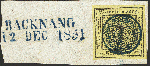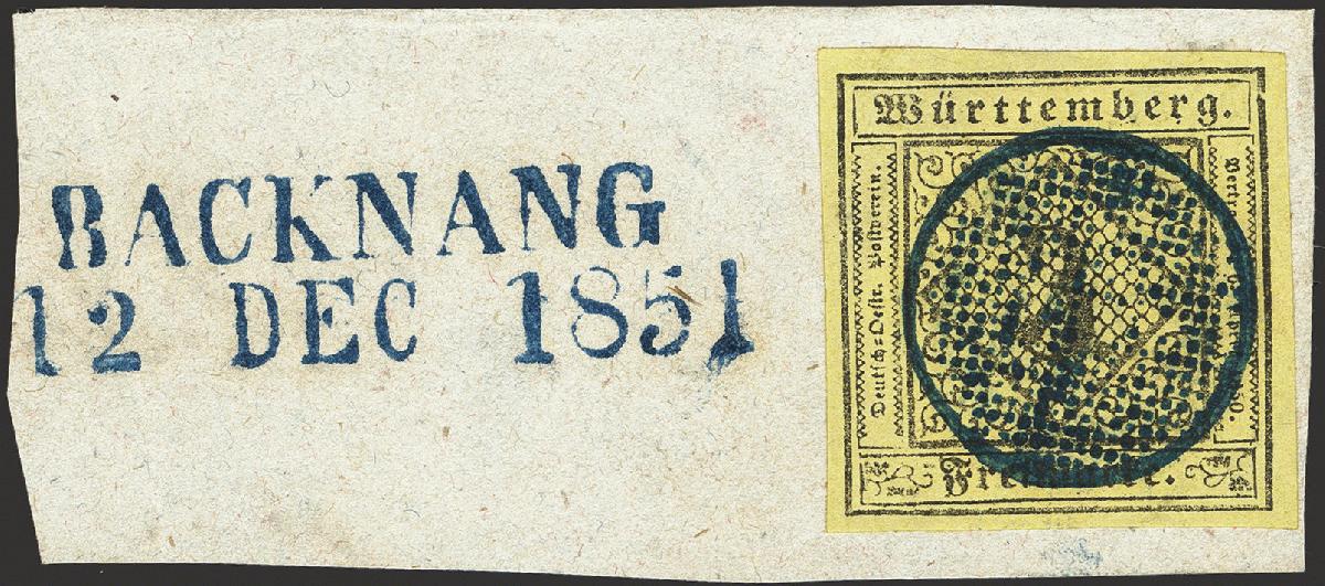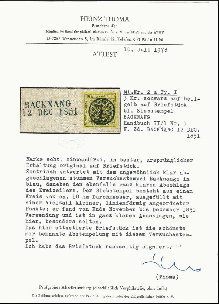 | Zusatzinformationen und Suchstichworte: | 376. Auktion Heinrich Köhler 19.-24. April 2021 Los 304 1851, 3 Kreuzer schwarz auf gelb, Type I, sehr schön farbfrisch und allseits breitrandig mit zentrisch und klar aufgesetztem blauen Siebstempel auf Briefstück mit klar nebengesetztem blauen Aufgabestempel "BACKNANG 12 DEC 1851". Besonders schöne frische und einwandfreie ursprüngliche Erhaltung. Belegstücke dieses sehr seltenen Stempels mit eindeutiger Datierung sind außerordentlich selten. Signiert Thoma BPP mit Fotoattest (1978) und Fotoattest Heinrich BPP (2021) Ausruf 2.000,00 EUR Zuschlag 2.000,00 EUR (aus der Sammlung Erivan Haub) |