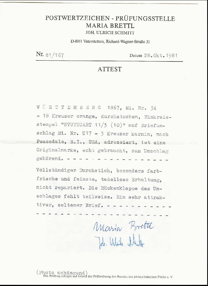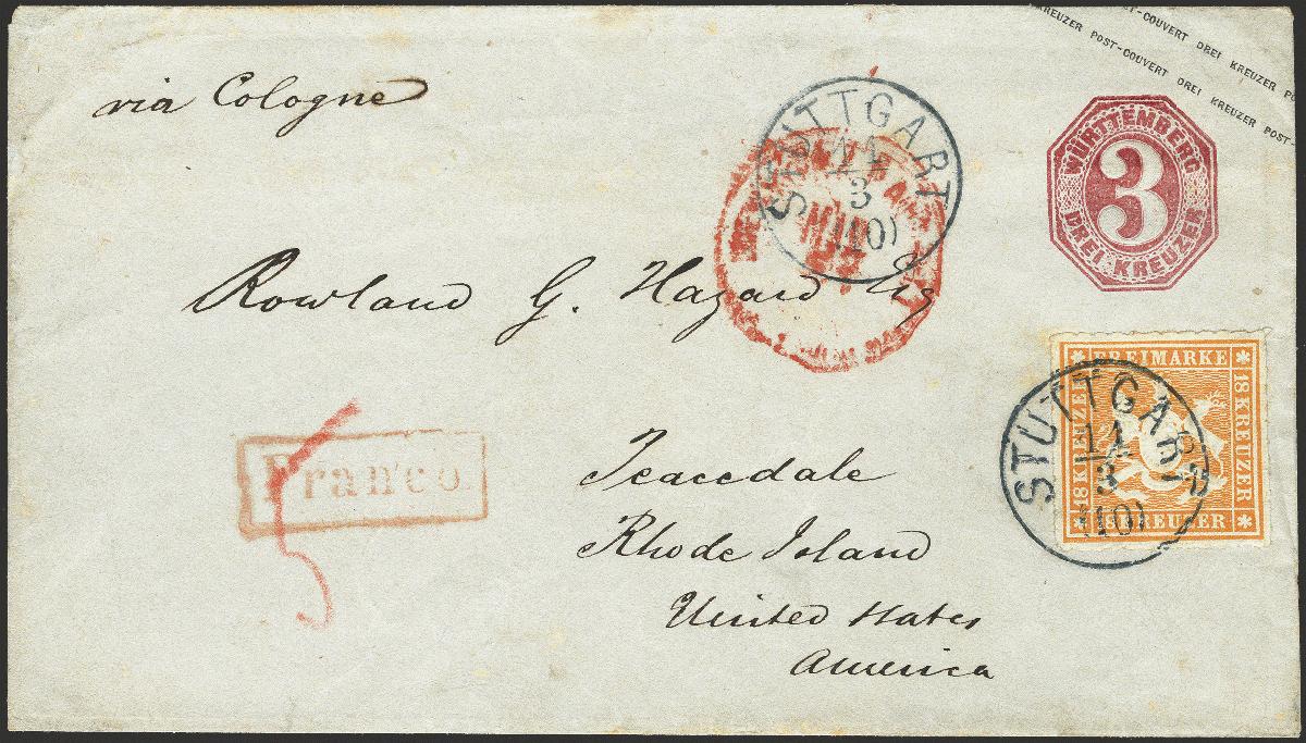 | Zusatzinformationen und Suchstichworte: | 376. Auktion Heinrich Köhler 19.-24. April 2021 Los 311 18 Kreuzer orangegelb, farbfrisch und gut durchstochen mit sauber auf- und nebengesetztem Einkreisstempel "STUTTGART 11/3" als Zufrankatur auf Ganzsachenumschlag 3 Kreuzer rosa mit Leitvermerk "via Cologne" und rotem Rahmenstempel "Franco" nach Peacedale im Staat Rhode Island, USA. Ein Teil der rückseitigen Verschlußklappe durch Öffnung entfernt und gering unfrisch, sonst einwandfrei. Der 21 Kreuzer-Tarif über Preußen hatte nur 1½ Jahre Bestand und wurde nur selten genutzt. Fotoatteste Brettl/Schmitt (1981) und Heinrich BPP (2021) Ausruf 1.000,00 EUR Zuschlag 5.800,00 EUR (aus der Sammlung Erivan Haub) |