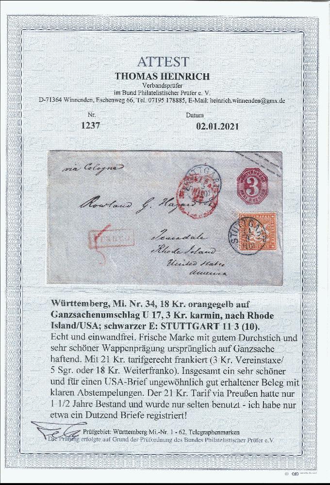 | Zusatzinformationen und Suchstichworte: | 376. Auktion Heinrich Köhler 19.-24. April 2021 Los 311 18 Kreuzer orangegelb, farbfrisch und gut durchstochen mit sauber auf- und nebengesetztem Einkreisstempel "STUTTGART 11/3" als Zufrankatur auf Ganzsachenumschlag 3 Kreuzer rosa mit Leitvermerk "via Cologne" und rotem Rahmenstempel "Franco" nach Peacedale im Staat Rhode Island, USA. Ein Teil der rückseitigen Verschlußklappe durch Öffnung entfernt und gering unfrisch, sonst einwandfrei. Der 21 Kreuzer-Tarif über Preußen hatte nur 1½ Jahre Bestand und wurde nur selten genutzt. Fotoatteste Brettl/Schmitt (1981) und Heinrich BPP (2021) Ausruf 1.000,00 EUR Zuschlag 5.800,00 EUR (aus der Sammlung Erivan Haub) |