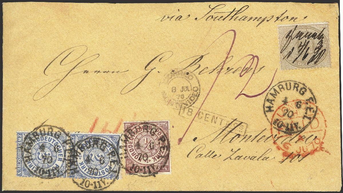 | Zusatzinformationen und Suchstichworte: | 376. Auktion Heinrich Köhler 19.-24. April 2021 Los 315 1868, ¼ Groschen bräunlichlila mit gezähnter Ausgabe 2 Groschen ultramarin im senkrechten Paar und Innendienstmarke 10 Groschen auf gelbem Briefkuvert von "HAMBURG P.E.1/ 4 6 70" über England nach Montevideo, Uruguay mit vorderseitigem Ankunftsstempel vom 8.7., nebengesetzter Rahmenstempel "18 CENTmos.". Der Brief ist mit 14¼ Silbergroschen portogerecht frankiert, der britische Anteil mit "1/2" ausgewiesen. Kleine Öffnungsmängel im Kuver behoben, die Frankatur einwandfrei. Ein attraktiver Brief nach Südamerika. Fotoattest Mehlmann BPP (2021) Ausruf 800,00 EUR Zuschlag 3.400,00 EUR (aus der Sammlung Erivan Haub) |
