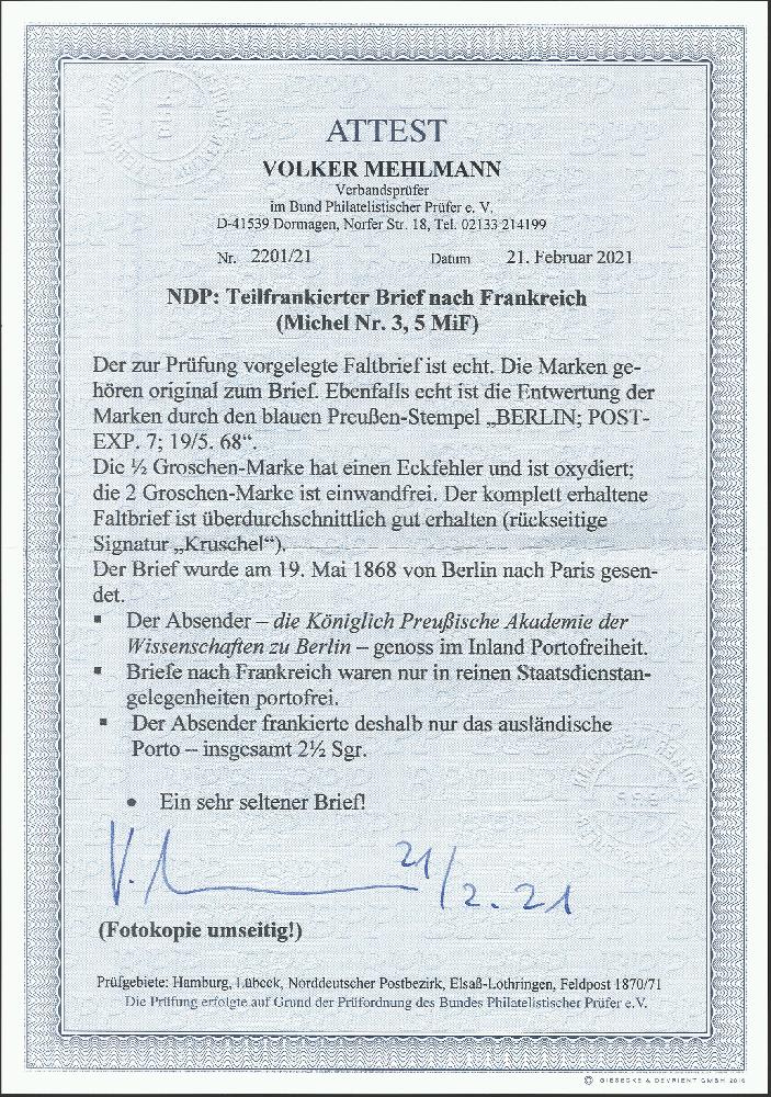 | Zusatzinformationen und Suchstichworte: | 376. Auktion Heinrich Köhler 19.-24. April 2021 Los 316 1868, ½ Groschen orange und 2 Groschen ultramarin mit blauem Rahmenstempel "BERLIN POST-EXP.7 19 5 68" auf vorgedrucktem Faltbrief "Angelegenheiten der königlich preußischen Akademie der Wissenschaften zu Berlin" an den Attaché der kaiserlichen Bibliothek in Paris. Die ½ Groschen etwas oxidiert und mit leicht defektem rechten Rand aufgeklebt, sonst gute Erhaltung. Die Akademie der Wissenschaften genoß im Inland Portofreiheit, das verklebte Porto stellt den französischen Portoanteil dar. Derartige Briefe sind außerordentlich selten und nur in wenigen Exemplaren bekannt. Fotoattest Mehlmann BPP (2021) Ausruf 500,00 EUR Zuschlag 560,00 EUR (aus der Sammlung Erivan Haub) |