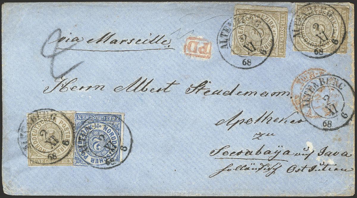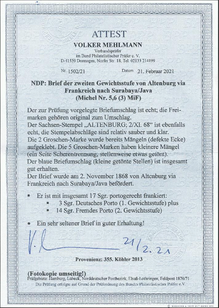 | Zusatzinformationen und Suchstichworte: | 376. Auktion Heinrich Köhler 19.-24. April 2021 Los 317 1868, 2 Groschen ultramarin und 3 Einzelwerte 5 Groschen ocker mit sächsischem Doppelkreisstempel "ALTENBURG 2 XI 68" auf Briefkuvert der 1. deutschen und 2. französischen Gewichtsstufe über Frankreich nach Soerabaija auf Java, Niederländisch Indien mit Ankunftsstempel vom 21.12. Die 2 Groschen wurde bereits defekt aufgeklebt, die übrigen Werten mit teils kleinen Mängeln, der Umschlag rechts leichte Altersflecken, jedoch insgesamt für diese Destination recht frische und gute Erhaltung. Ein attraktiver Übersee-Brief mit seltener Destination. Fotoattest Mehlmann BPP (2021) Ausruf 1.000,00 EUR Zuschlag 3.400,00 EUR (aus der Sammlung Erivan Haub) |